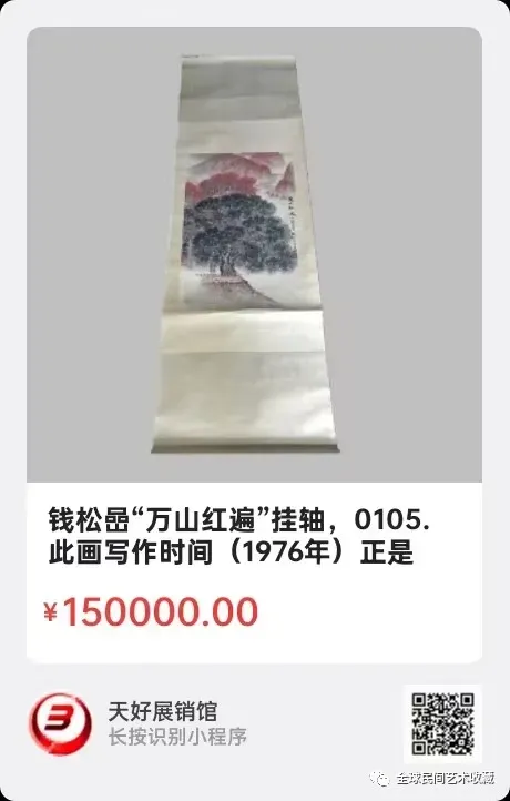 钱松嵒“万山红遍”挂轴,画面尺幅68x44厘米,此画写作时间(1976年)正是大师在南京疗养时期所作。大师的红色系列画作,也正是在60年代和70年代期间,形成了自己的鲜明风格。(可议价)。已经王国成专家鉴定为真品。来源:0105。V。