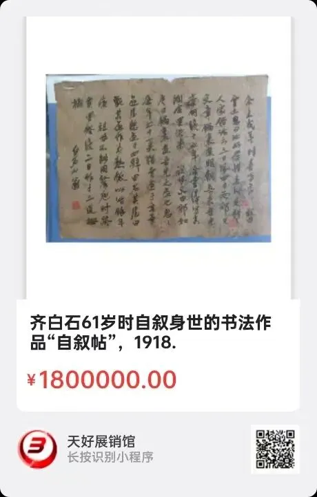 齐白石61岁时自叙身世的书法作品“自叙帖”;长21厘米,宽28厘米。全帖共计142个字。加盖五枚私印表示慎重。仔细观察,能看到这幅作品是创作在一幅画上的;有比较清晰的山石,花卉和使用了红色颜料,在”奈何”二字旁可以看到画有一只“知了”。这符合齐白石老人节俭的生活习惯作风。这件书法作品没有做装裱,保持原汁原味的老样子。我用塑封纸封存保管,不接触空气保存。这是齐白石老人留存于世的绝无仅有的一件自叙身世的书法作品。这幅书法作品经过齐白石老人的后辈齐良芷汤发周的鉴定;真品无疑。来源1918。V.
