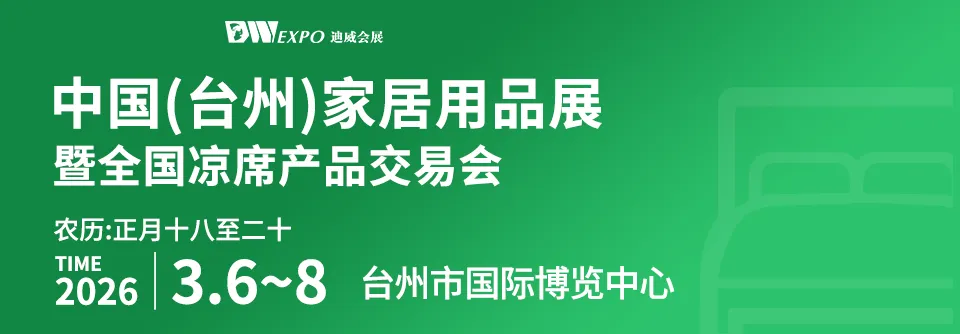 2026第10届中国(台州)家居用品展暨全国凉席产品交易会由台州市迪威展览有限公司承办。展会已成功举办9届,本届规模达30,000平方米,展品体系丰富多元:核心覆盖竹席、草席、亚麻席、牛皮席、冰丝席、冰藤席、凉豆豆席等全品类凉席,家用纺织、蚊帐、空调被、四件套等床上用品,以及凉席基础原料、生产机械等产业链配套产品。