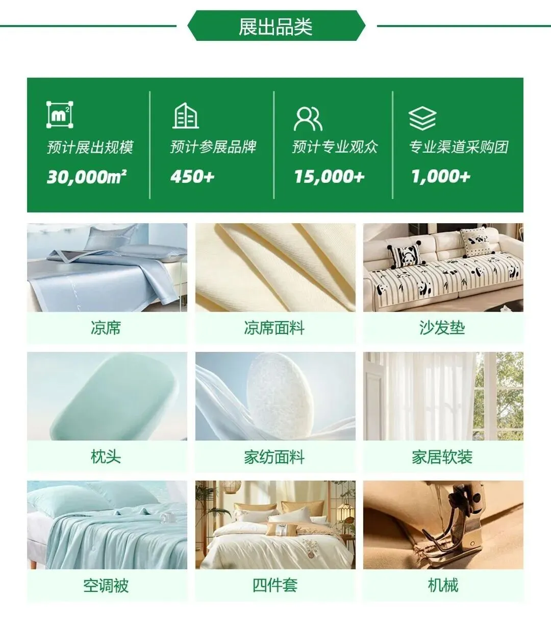 作为国内大型专业凉席展,展会吸引了台州、南通、宁波、安吉、河北、福建等全国知名凉席生产加工基地企业的广泛关注与积极参与。随着展会规模持续扩容,展品范围进一步延伸至窗帘、沙发垫、地毯等家居软装,以及塑料制品等日用百货领域,实现从凉席核心品类到家居全品类的全覆盖。