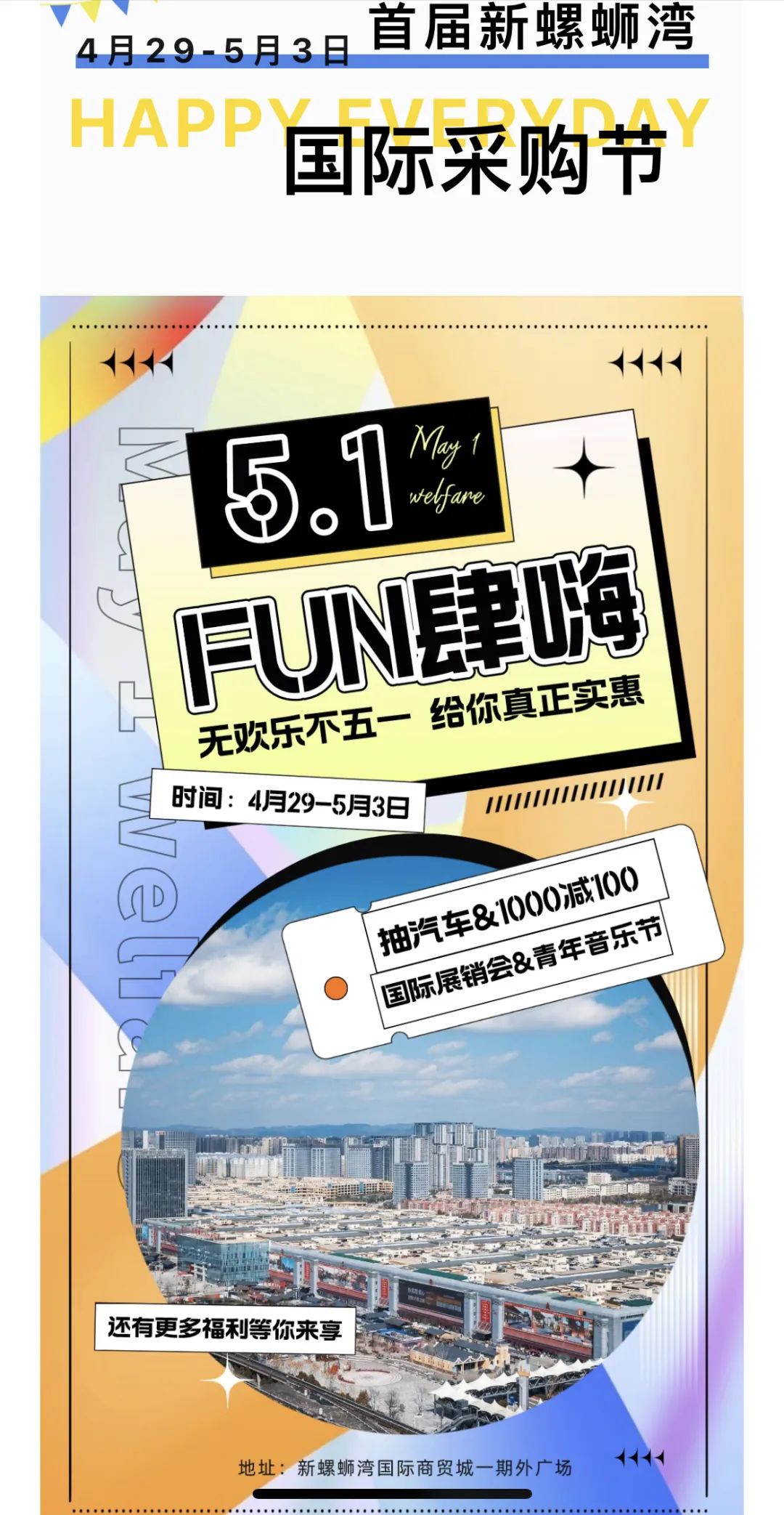 2023首届新螺蛳湾国际采购节在区委区政府全力支持下,在由矣六街道办事处、俊奥商业有限公司共同主办,将于4月29日-5月3日在官渡区矣六街道新螺蛳湾国际商贸城一期西广场、滇忆465街区及红石榴广场举办,以“稳外贸,扩内需,促消费”为主题,采用“国际展销+商贸论坛+青年音乐+民族文化”等形式,设置满额抽奖、满额减免等优惠活动,旨在提升新螺蛳湾国际商贸城对南亚东南亚国家的辐射影响力,打造面向南亚东南亚进出口商品商贸市场,有效激发居民消费潜力和消费动力,助力官渡区高水平对外开放和经济高质量发展。