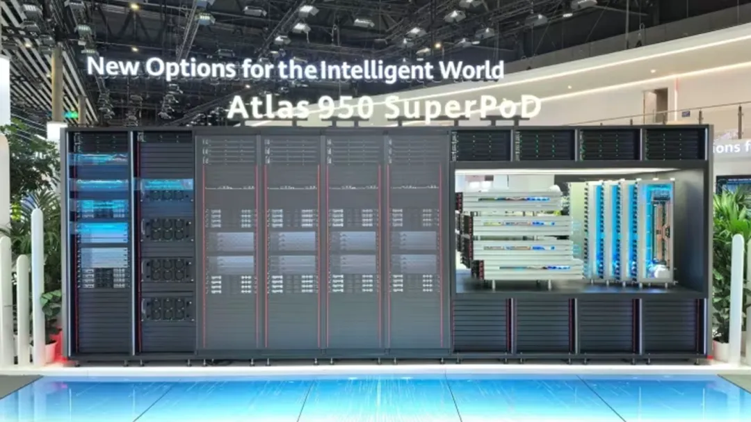 Atlas 950 SuperPoD超节点:首次在海外展出,最大支持8192张昇腾卡互联,自研灵衢协议,通信时延200纳秒,已商用数百套。