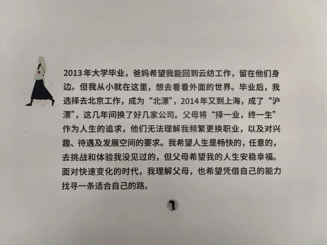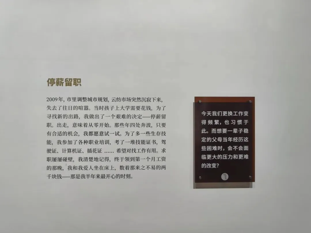 展览以对云南纺织工人的田野调查和口述史为基础,以20余位纺织工人的人生史为蓝本,采用非虚构写作,讲述了一位纺织女工的人生故事,呈现了新中国工业化时代以来纺织工人的工作与生活,思想与情感,并以两代人的对话为线索,发起不同时代、不同世代的人的对话。