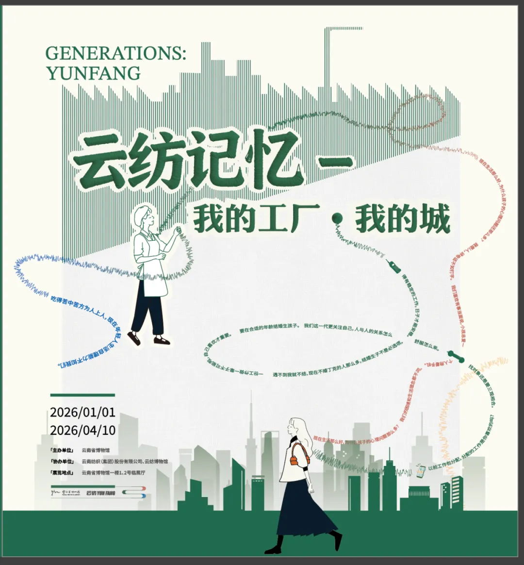 2026年1月1日,由云南省博物馆主办、云纺博物馆协办的原创大展《云纺记忆——我的工厂·我的城》在云南省博物馆开展。该展览是云博“3+1”展览体系框架下“前沿探索”系列的一个实验性展览。