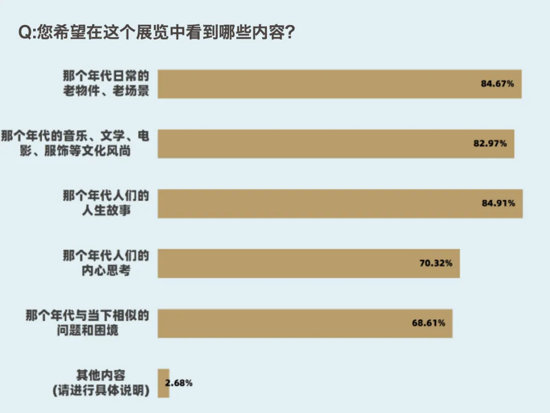 问卷调查中,大家对“最想看到的展览内容”进行了选择:其中约85%的受访者选择“人生故事”,85%想看“老物件和场景”,83%关注“文化风尚”,这为我们挑选展品、确定展陈方式提供了依据,也让我们决定在展览设计中以场景化叙事手法为主,将老物件、人生故事与文化风尚三类元素进行有机融合。
