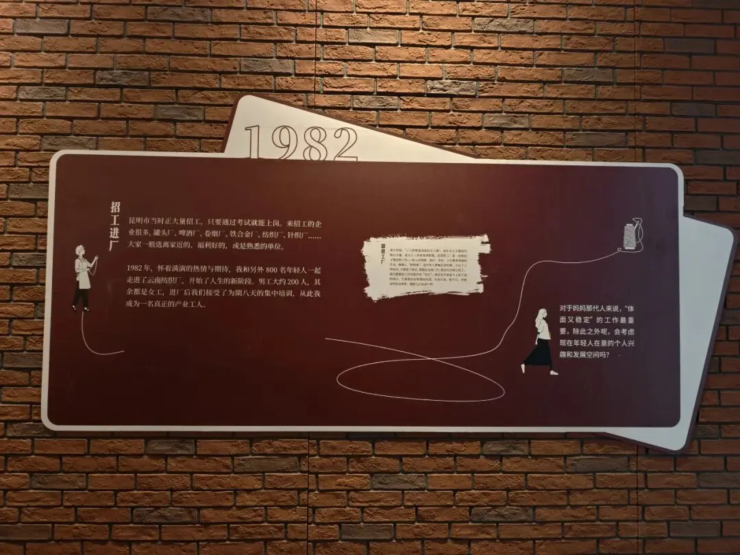 通过微观叙事折射工业遗产记忆及时代记忆是这个展览的目的之一,但同时,我们也希望通过鲜活的个人生命故事来传递坚韧、适应、勇于面对困难的生命力,正是这种力量让一代代人生生不息。因此,我们以20余位纺织工人的人生史为蓝本,采用非虚构写作凝练出了一位纺织女工的人生故事。这位主人公出生于1963年,在六七十年代度过童年与少年。正值中国工业繁荣的八十年代,她通过招工进入云南纺织厂成为一名纺织工人,融入到轰轰烈烈的工业化建设中。九十年代以后随着国企转型,云纺退出国企,她转岗、留职停薪、找工作,数年后重新回到云纺工作,退休。不同于宏大、群体性的叙事,展览通过微观、个体的叙事描述了一位普通工人的一生,以及生活中的细节,思想,情感,以呈现真实的、鲜活的人,达求与个体生命经验的连接与共情。