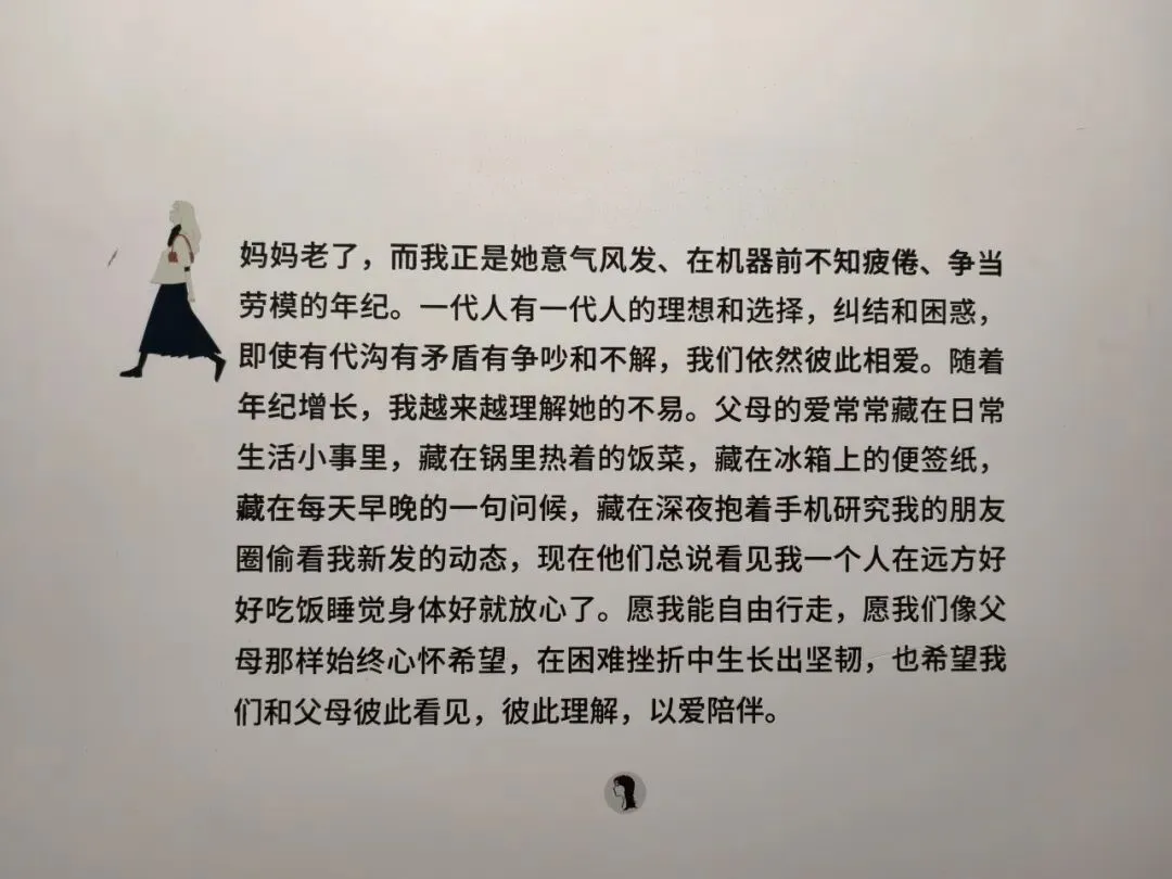 在“代际对话”的主题下,我们采用了双叙事线的写法,以纺织女工(六十年代出生)和她女儿(九十年代出生)的对话贯穿展览,将母亲的回忆与讲述和女儿的聆听与回应并置。在母亲的讲述中,女儿的回应反映出代际认知的差异。在聆听父辈的经历中,孩子或许能逐渐理解并对自己的当下有所关照。