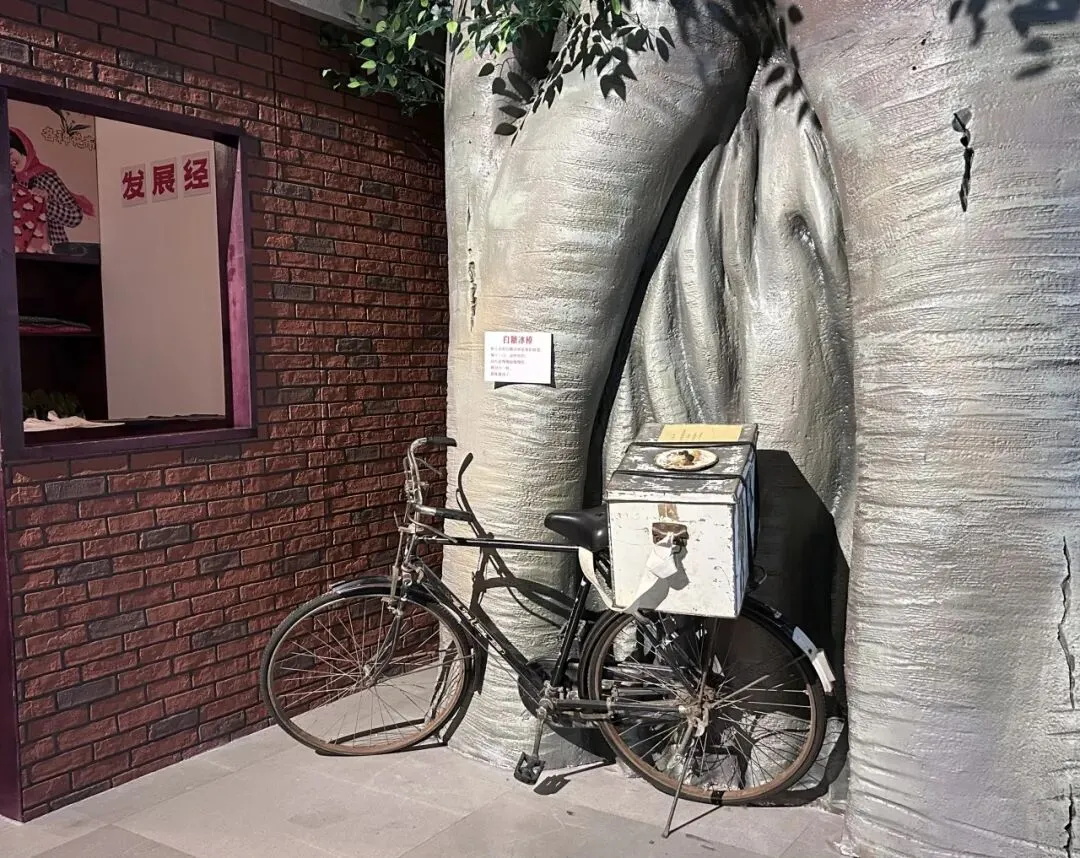 展览的第一部分“小时候”采用实景还原,红砖墙、火车厢样式的房子、缝纫机、高低床、蜂窝煤、供销社、小人书摊、露天电影等,再现了六七十年代人的生活。