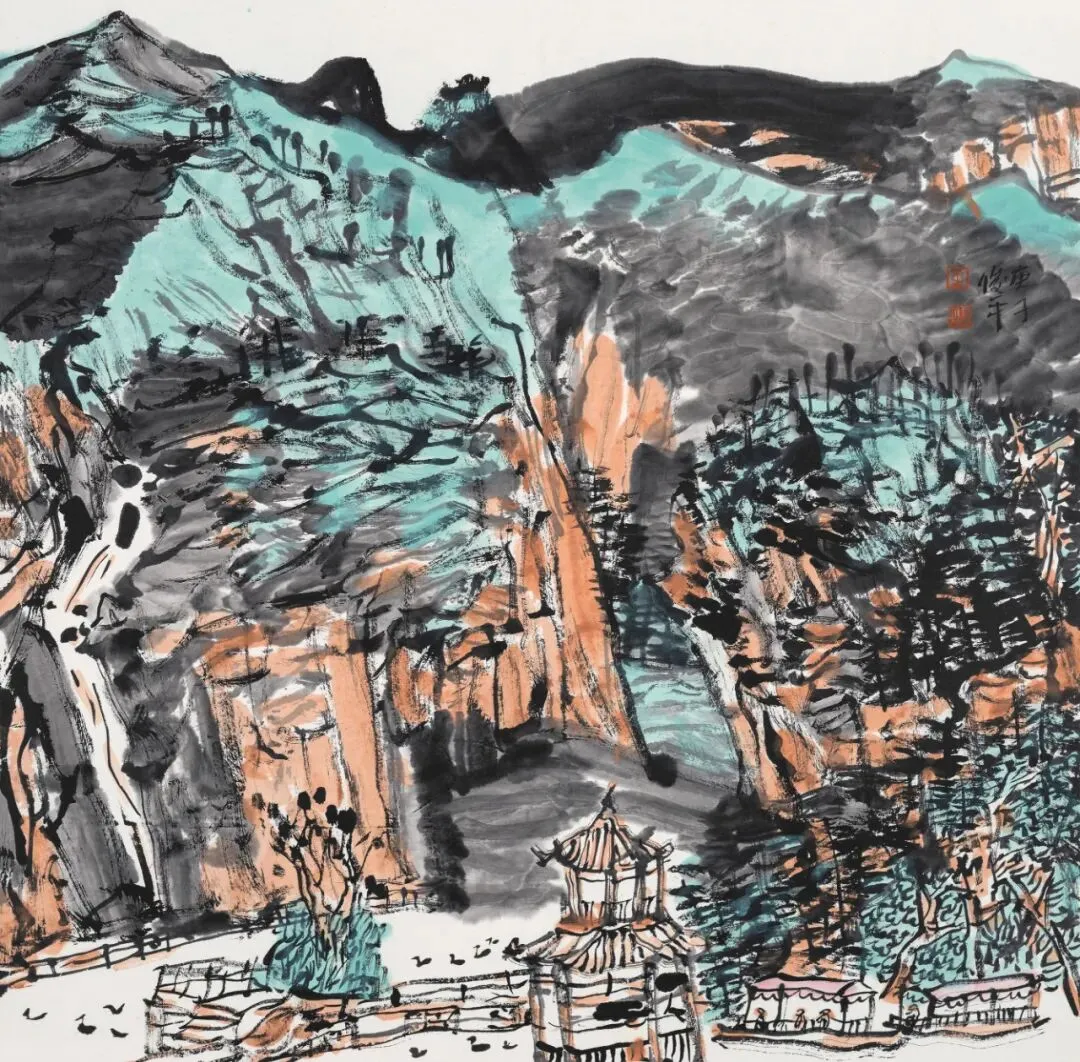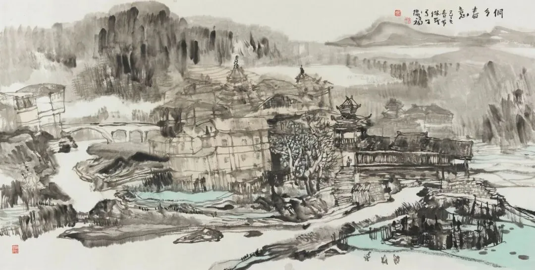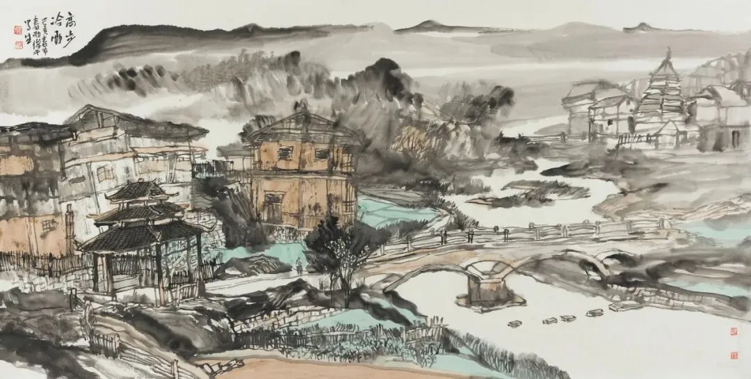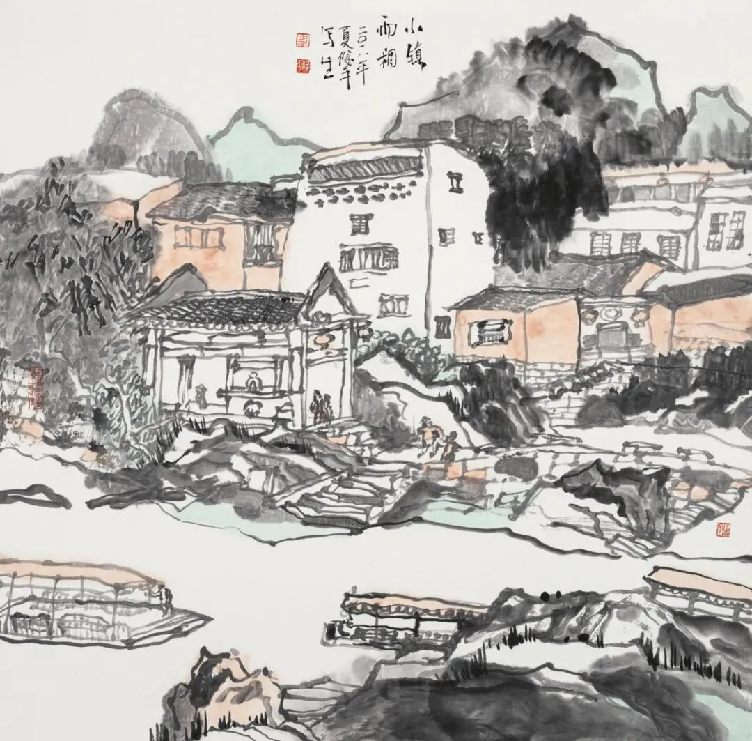 同时,韦俊平以墨为骨,以色为韵。他既以传统水墨为根基,用笔用墨为骨法,勾勒出山石树木的结构形态,又颇具胆识以明快的色彩(如石青、石绿、赭石等)描绘南方的青山绿水、田园春秋,使他的艺术世界从早期相像于格胜导师,到成就自己艺术的辨识度:既充满了叙事性和生命感,又洋溢着南方山水的温润、静远与灵秀之气,更充满了现代感和视觉张力,并成长为“漓江画派”代表性画家之一,还以“漓江画派”促进会会长之名,助推画派蔚然成林。