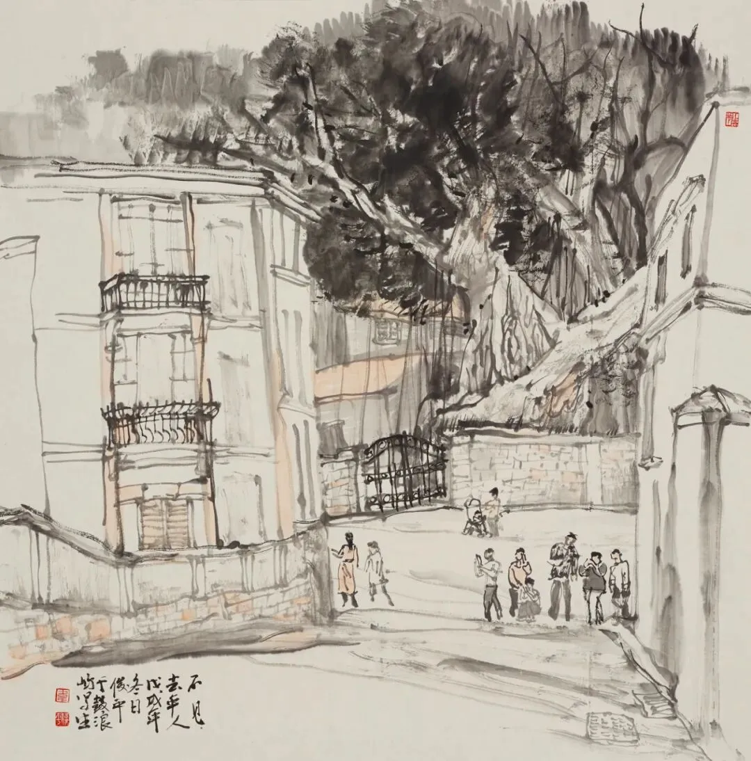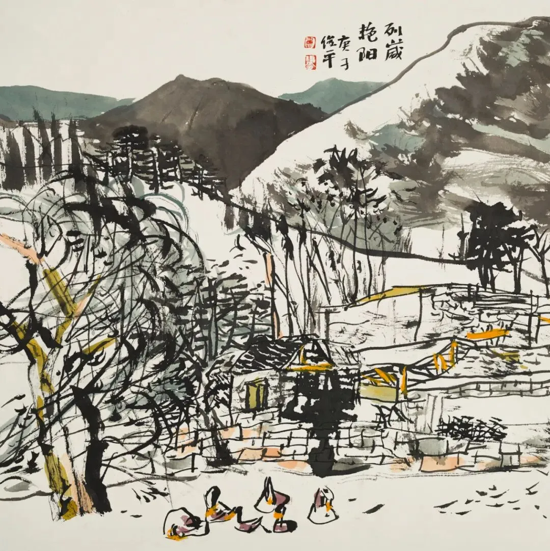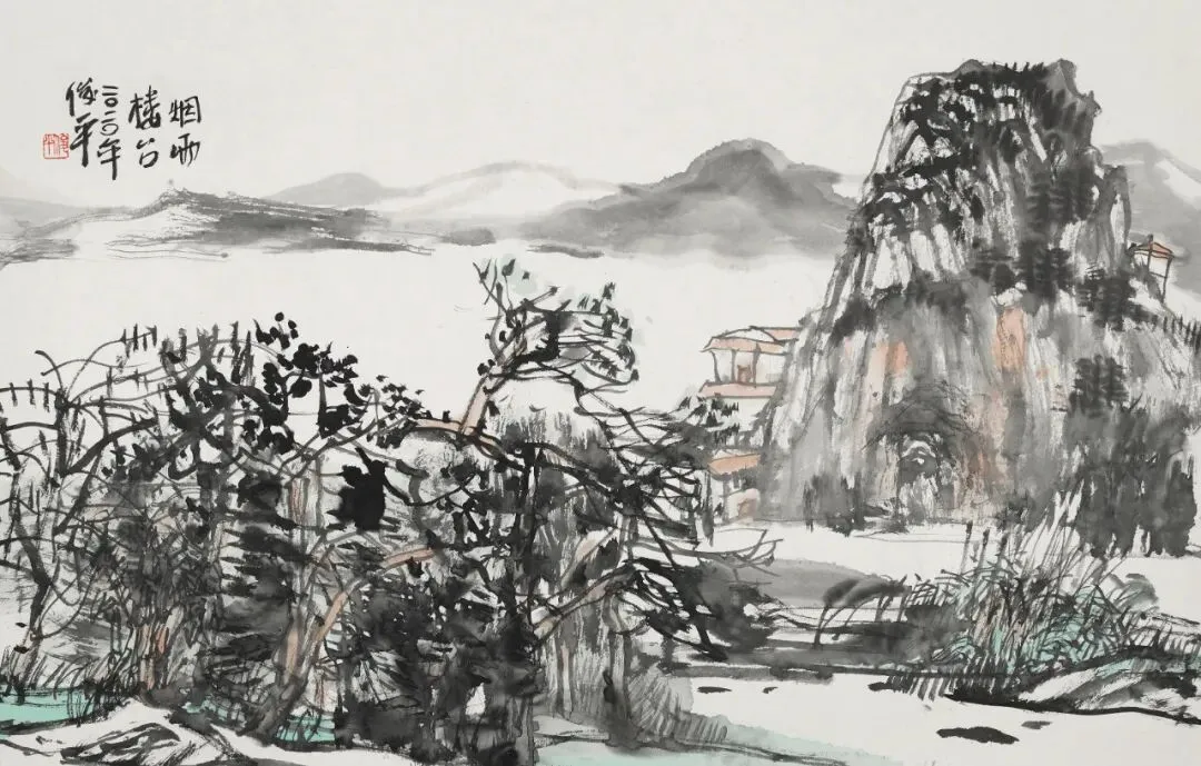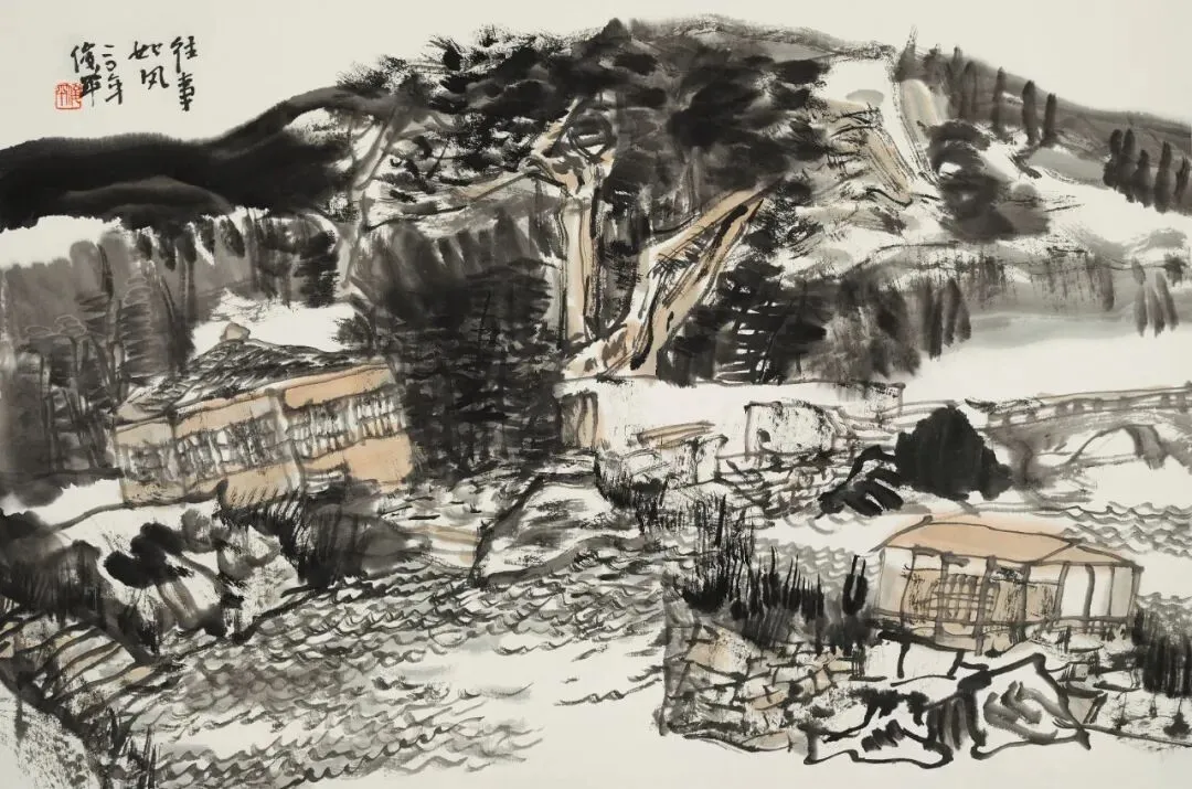 同时,韦俊平以墨为骨,以色为韵。他既以传统水墨为根基,用笔用墨为骨法,勾勒出山石树木的结构形态,又颇具胆识以明快的色彩(如石青、石绿、赭石等)描绘南方的青山绿水、田园春秋,使他的艺术世界从早期相像于格胜导师,到成就自己艺术的辨识度:既充满了叙事性和生命感,又洋溢着南方山水的温润、静远与灵秀之气,更充满了现代感和视觉张力,并成长为“漓江画派”代表性画家之一,还以“漓江画派”促进会会长之名,助推画派蔚然成林。