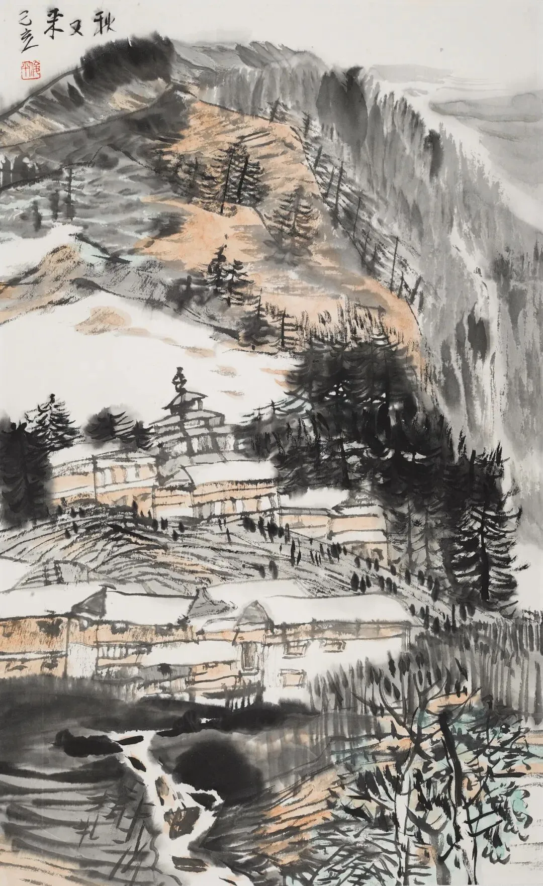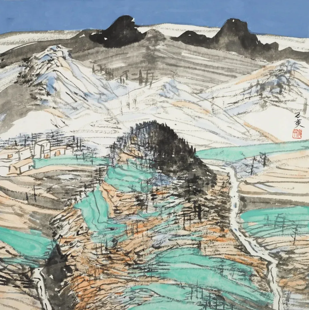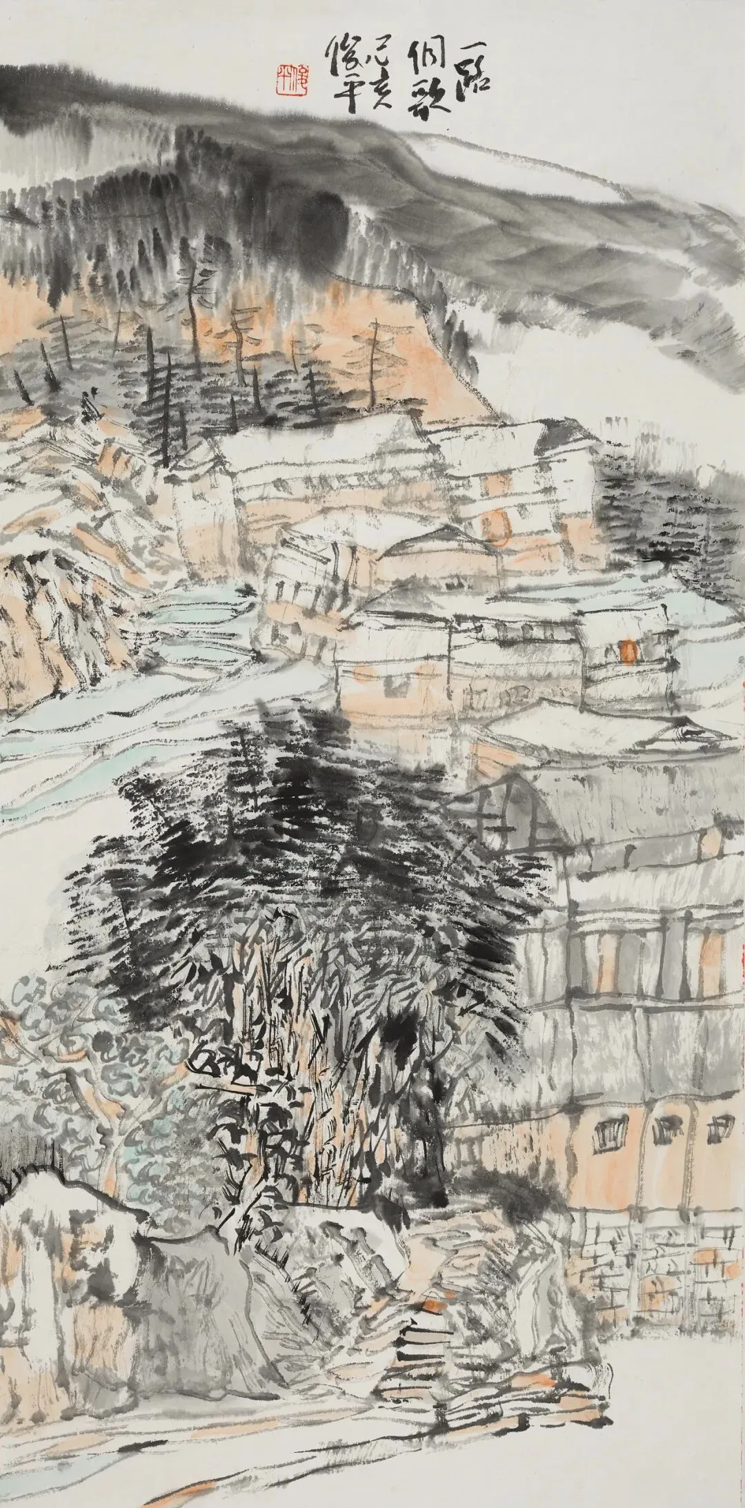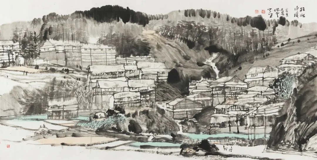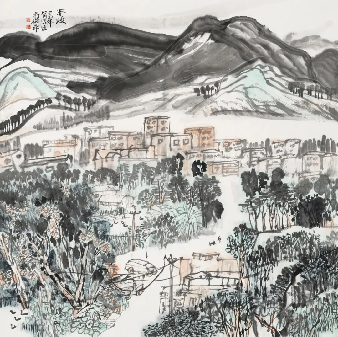 韦俊平的画是入世的,笔墨的山河烟火、人勤春秋,潜行的是人间喜乐与时代变迁;韦俊平的画又是出尘的,辽远静好,生机勃勃,是野气横生的南方诗意。可见,他画作的底层逻辑是哲学、情感与审美。正如他的画语:“我只画我熟悉的、感动我的山水,既不拔高也不贬低,更不会无病呻吟。”朴素真言映照出一颗澄明的赤子之心,以及深沉的现实主义精神。是的,质朴的韦俊平总是那么沉静而坦诚、持久而有尊严地描绘自己所爱的广西山水,尤其家乡都安的美好。“不拔高”,意味着他不将乡村田园浪漫化为世外桃源,避免了那种廉价的、脱离现实苦难的赞美,他的乡情带着体温和田野的味道。“不贬低”意味着他不以居高临下的“启蒙”视角,将乡村视为落后、愚昧的象征,他尊重故乡的土地和父老乡亲,他的画作充满着深情和生机。