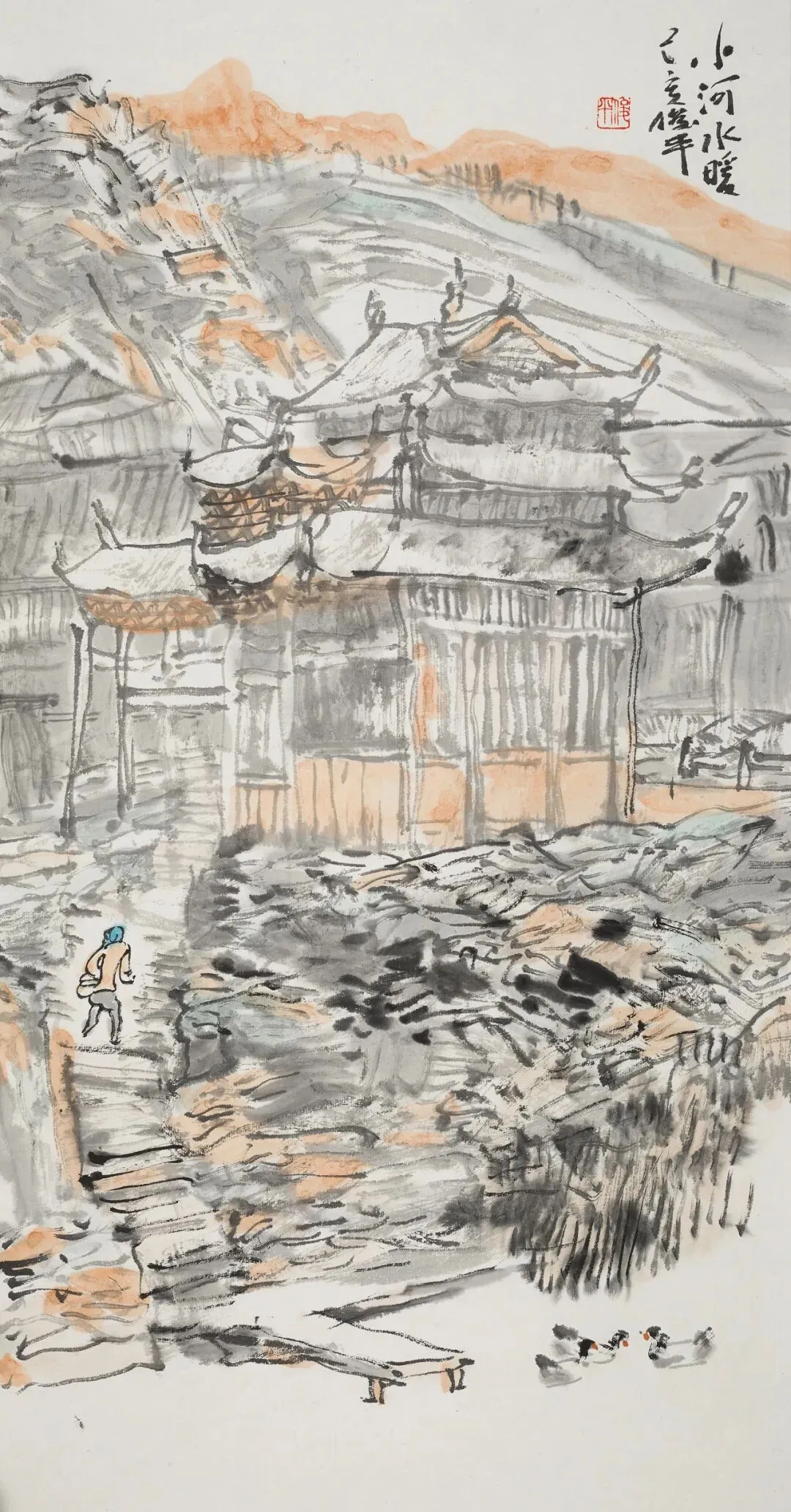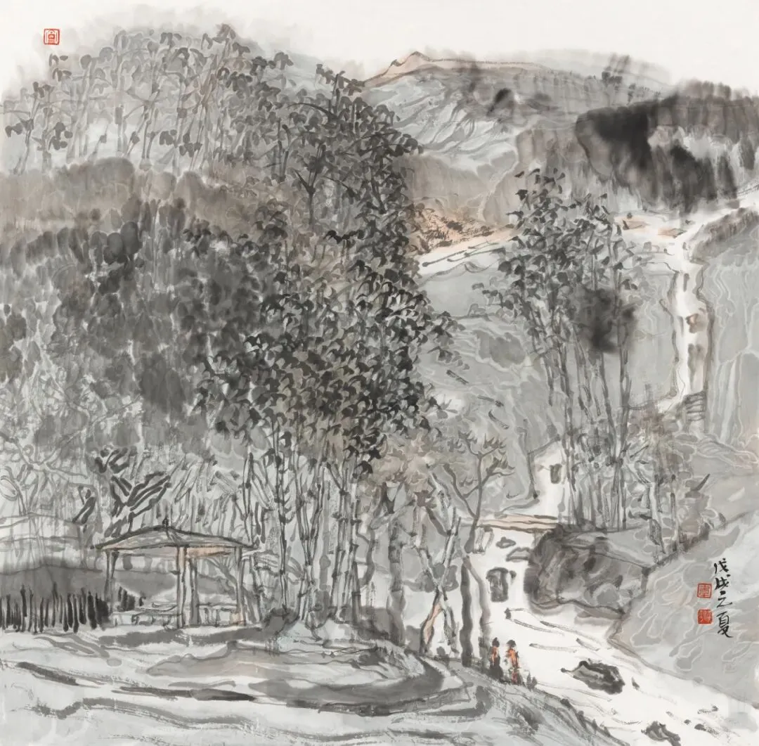 如此的赤诚,来自画家心中眷恋家乡长出的血肉。几十个春秋,韦俊平心灵深处的情愫越拉越长,一种对追溯起源的执着,牵引着他每年的节假日都往红水河畔奔跑,奔向老家屋里日渐沧桑的父母,奔向99岁高寿的奶奶,奔向家乡的竹林山涧,奔向哺育他的父老乡亲,年复一年;而家乡的召唤也越来越清晰,红水河的涛声在他的心底不断鸣响,回家的路每天都在等待游子。这双向绵长的乡情最终化为他的笔墨山河:浸润着浓浓的乡愁与眷恋的喀斯特峰林、红水河畔、山路弯弯、田野四季、农家小院,在韦俊平水墨的氤氲变化和色彩的微妙渲染下,山水间瞬息万变的自然光影和人间气息,就创造出诗意南方的蓬勃,那是画家心灵的来处,当然也是画家艺术的未来。