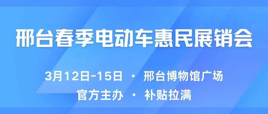由邢台市商务局、邢台新闻传媒中心主办的邢台市春季电动车惠民展销会重磅来袭,官方主办、品牌齐聚、优惠拉满,换车买车正当时!