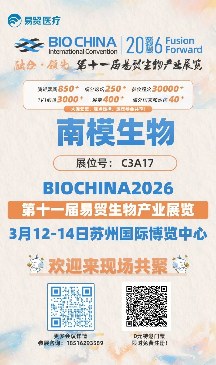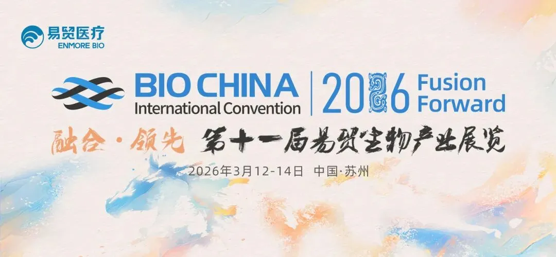 BIOCHINA2026(第十一届)易贸生物产业展览将于2026年3月12-14日在苏州国际博览中心举行,本届大会汇聚产研学医资多方关键力量,共话前沿趋势,共探生物产业未来!