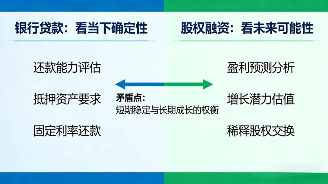 很多企业做不成贷款,却能拿到投资很多企业主都会遇到一个很困惑的情况。 银行贷款很难批, 但投资机构却愿意聊股权融资,甚至给出不错的估值。 很多人第一反应是: 是不是银行太保守了。 但如果把两种融资方式放在一起看,其实逻辑完全不同。 债权融资和股权融资,本来就不是用同一套标准在看企业。 债权融资看的是已经发生的事实 银行做的是债权,本质上是把钱借给企业,并且要在固定期限内收回来。 所以银行最关心的永远是三件事: 企业现在赚不赚钱, 现金流稳不稳定, 负债结构安不安全。 银行看的,几乎全部都是已经发生的东西: 营收是多少,利润多少,负债多少,应收账款多久能回。 这些都是冷冰冰的数据,但也是银行判断风险最可靠的依据。 企业讲故事、讲未来、讲市场空间,在银行体系里通常只是一种补充。 股权融资看的是未来 投资机构就完全不一样。 他们买的不是利息,而是企业未来的增长。 所以他们更愿意花时间研究: 行业未来有没有空间, 技术是不是有壁垒, 创始人有没有能力把事情做大。 在很多早期项目里, 企业甚至还没有稳定利润,但只要增长逻辑成立,投资机构依然会下注。 他们赌的是未来十年的变化。