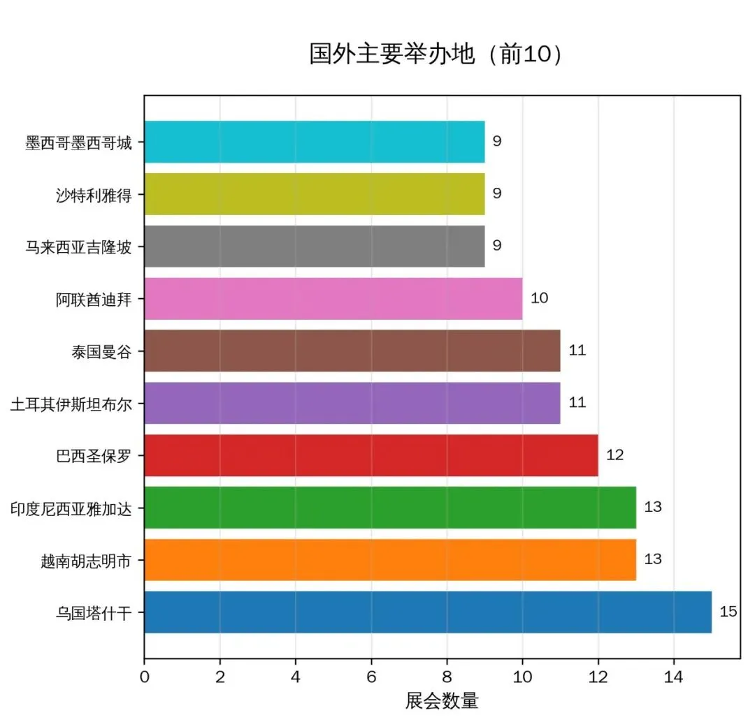 国际化导向明显:96.7% 的展会布局国外,重点覆盖中亚、东南亚、南美等新兴市场