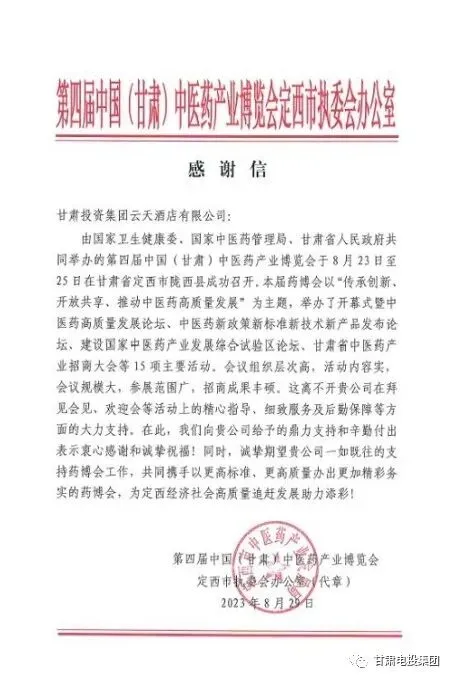 近日,第四届中国(甘肃)中医药产业博览会定西市执委会办公室致信甘肃电投会展集团,就会展服务保障团队在第四届“药博会”期间,提供的服务保障工作表示感谢。