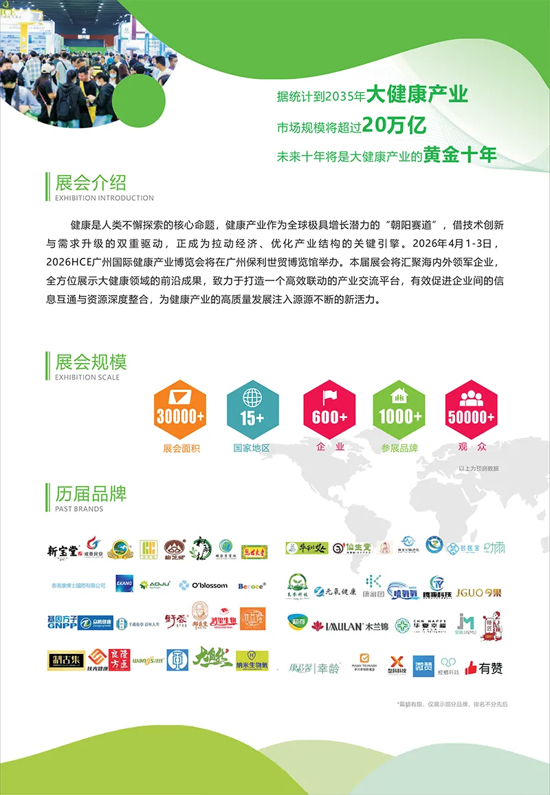 健康是人类不懈探索的核心命题,健康产业作为全球极具增长潜力的“朝阳赛道”,借技术创新与需求升级的双重驱动,正成为拉动经济、优化产业结构的关键引擎。2026年4月1-3日,2026HCE广州国际健康产业博览会将在广州保利世贸博览馆举办。本届展会将汇聚海内外领军企业,全方位展示大健康领域的前沿成果,致力于打造一个高效联动的产业交流平台,有效促进企业间的信息互通与资源深度整合,为健康产业的高质量发展注入源源不断的新活力。