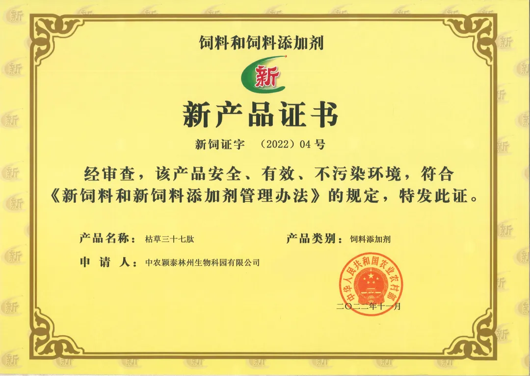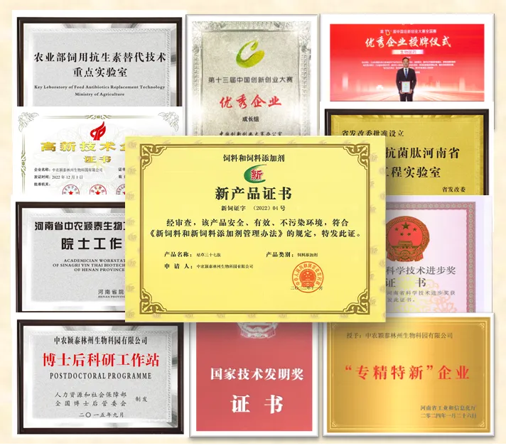 中农颖泰始终秉持着“让抗菌肽造福全人类”的企业愿景,始终专注于抗菌肽的基础研究及应用研究。目前中农颖泰已率先开发出八个抗菌肽,取得了一大批国际领先的具有自主知识产权的科技成果。公司于2022年11月3日,在国内率先取得枯草三十七肽国家新饲料添加剂证书(农业农村部公告第614号),并明确了抗菌肽的结构,制定了相应的检测标准。公司先后获得了国家技术发明奖、国家创新创业大赛奖、河南省科学技术进步奖等诸多荣誉。
