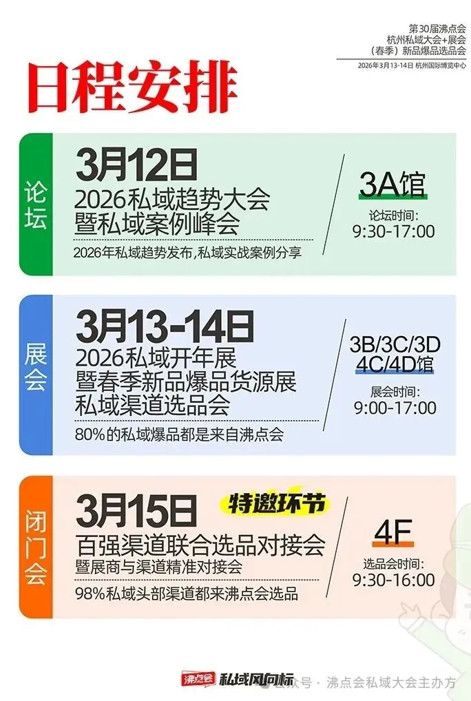 ✅ 3 月 13-14 日 3B/3C/3D/4C/4D 馆 9:00-17:00核心展会专场:2026 私域开年展暨春季新品货源展