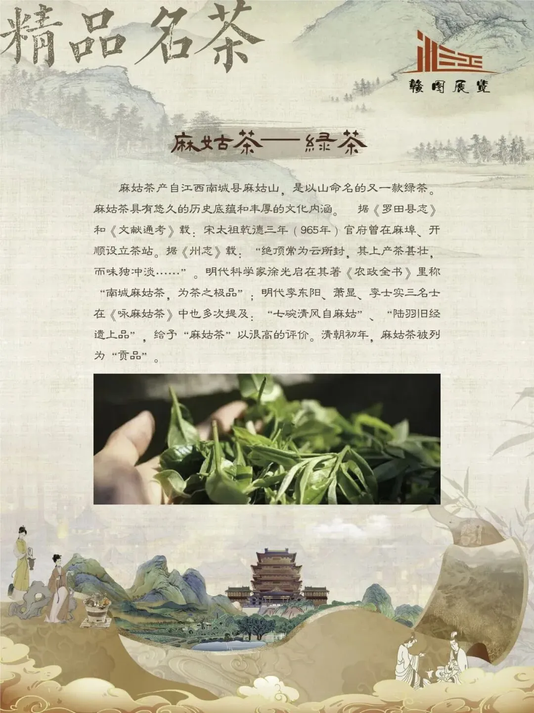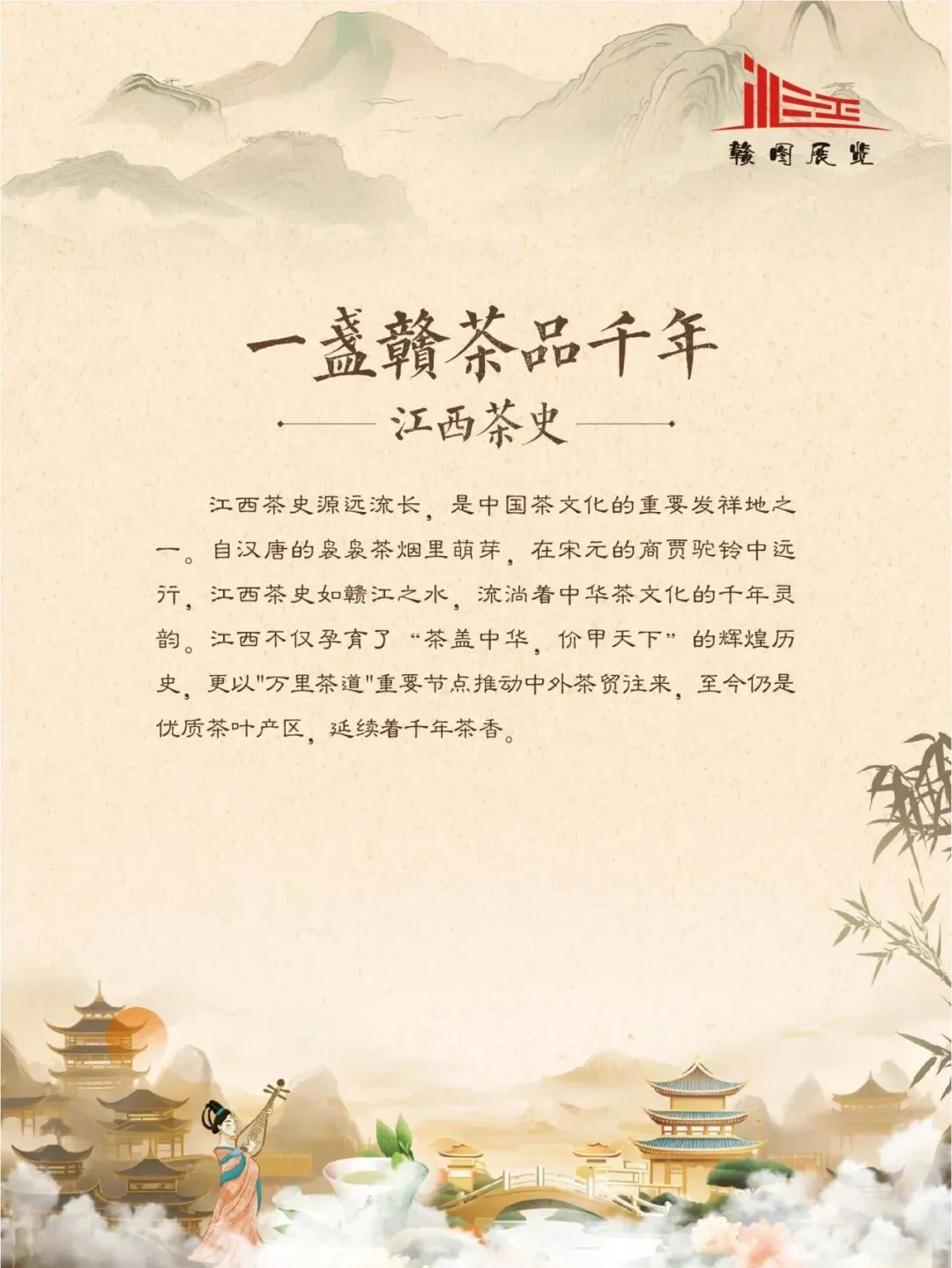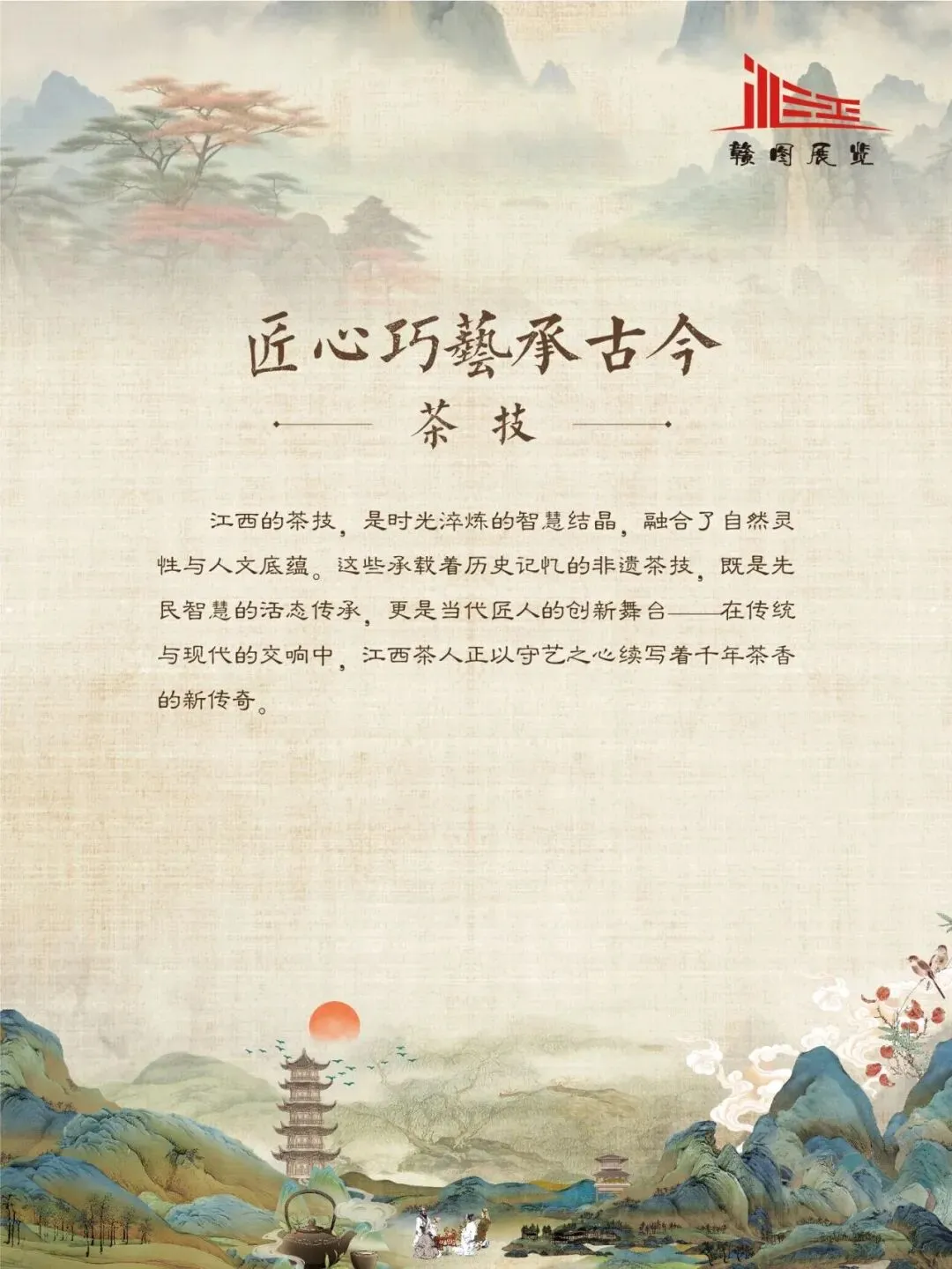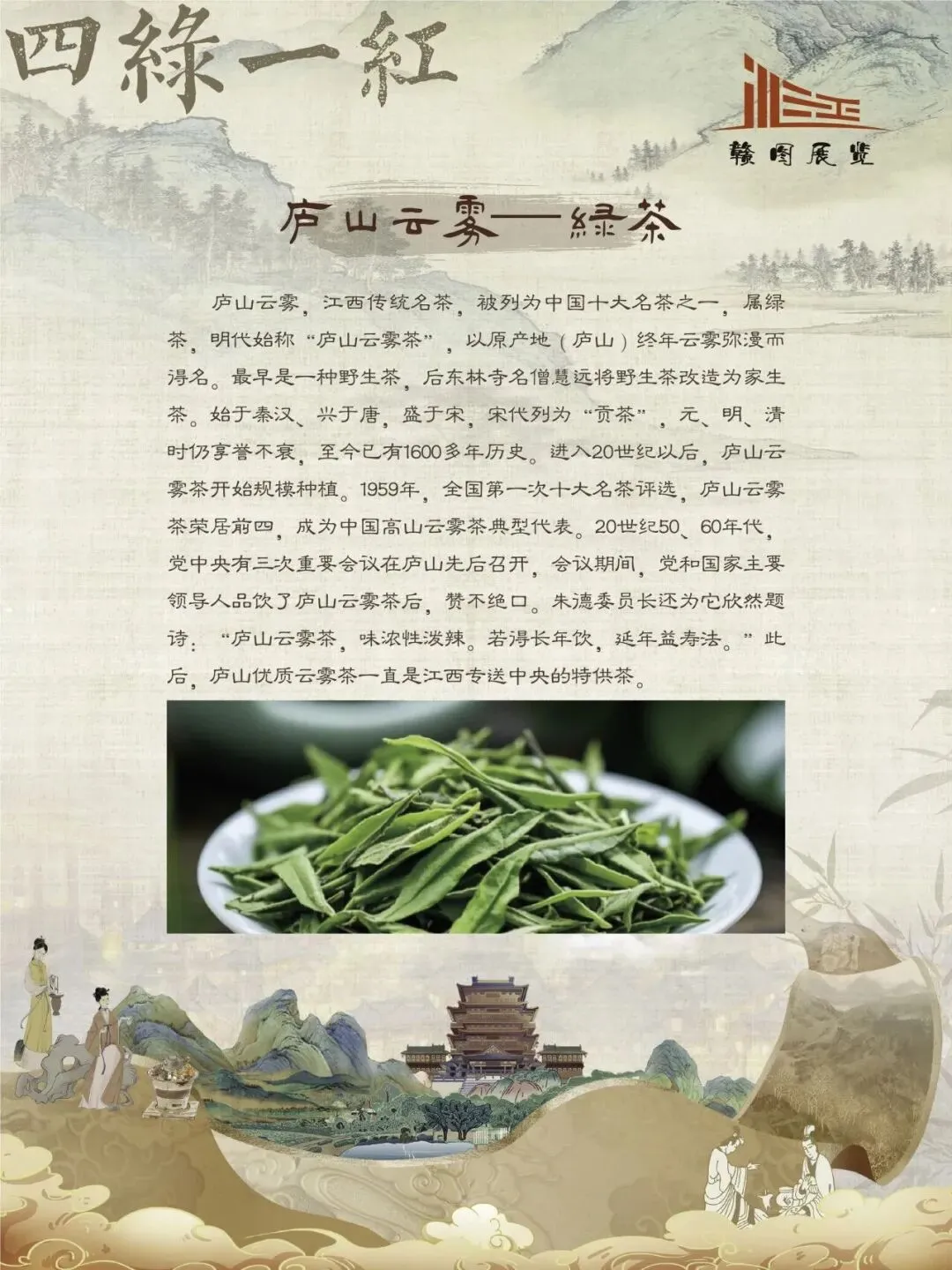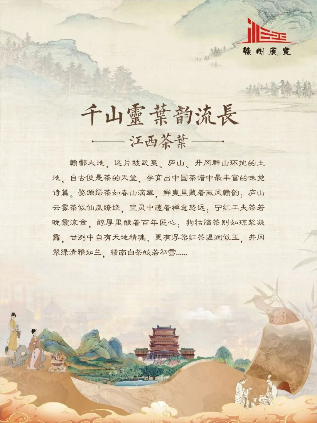 赣鄱大地,山水灵秀,云雾氤氲,自古便是茶香浸润的沃土。江西的茶叶文化,如一缕绵延千年的芬芳,深植于这片土地的脉络之中。从庐山之巅的茫茫云海,到婺源山间的碧绿茶园;从唐代舟头“商人重利轻别离,前月浮梁买茶去”的商贾盛景,到宋时禅林古刹中“茶禅一味”的哲思沉淀,江西的茶史既是自然的馈赠,亦是人文的瑰宝。 《茶香赣韵——江西茶文化展》邀您展开这幅茶香长卷,品味的不仅是茶的色香味韵,更是一方水土的灵性、一群匠人的坚守,以及一个民族对自然与生活的永恒礼赞。
