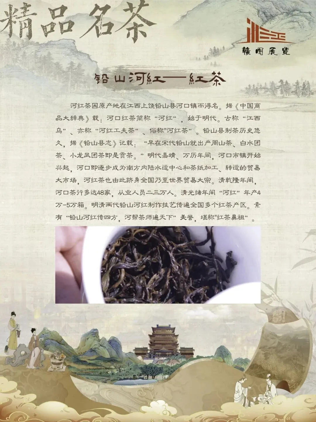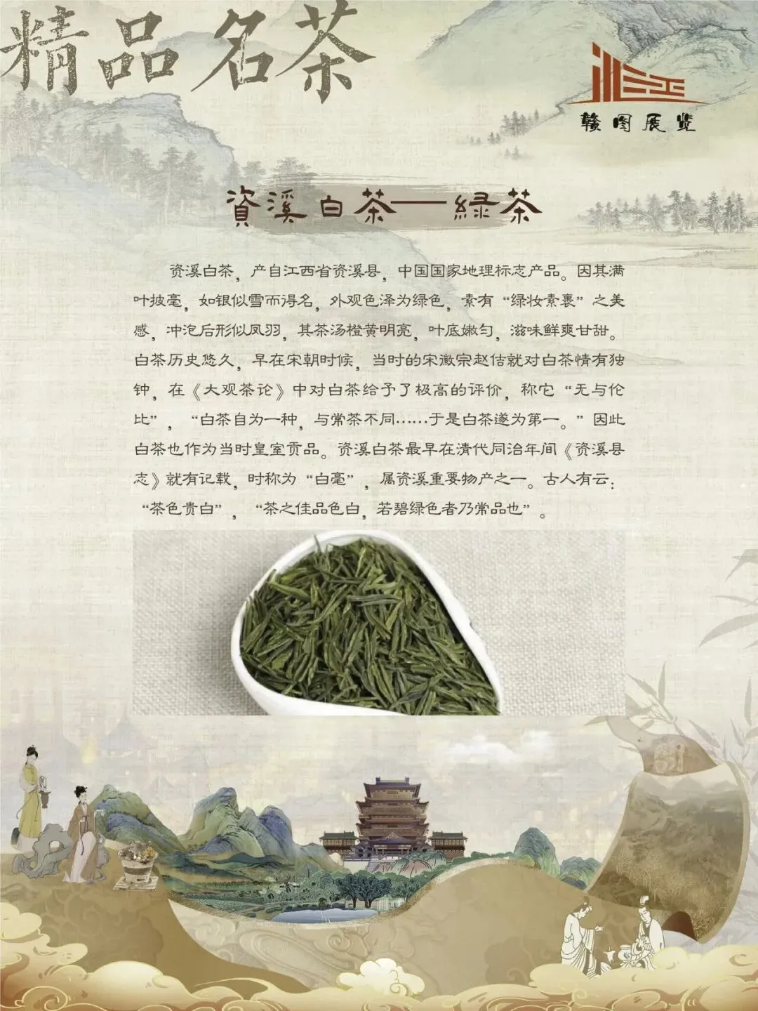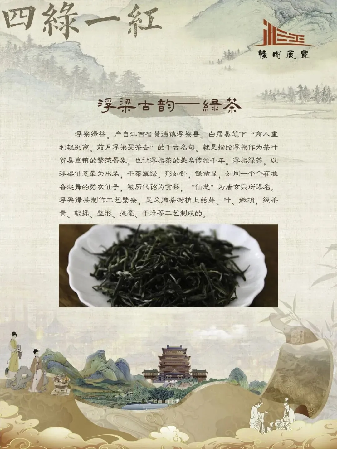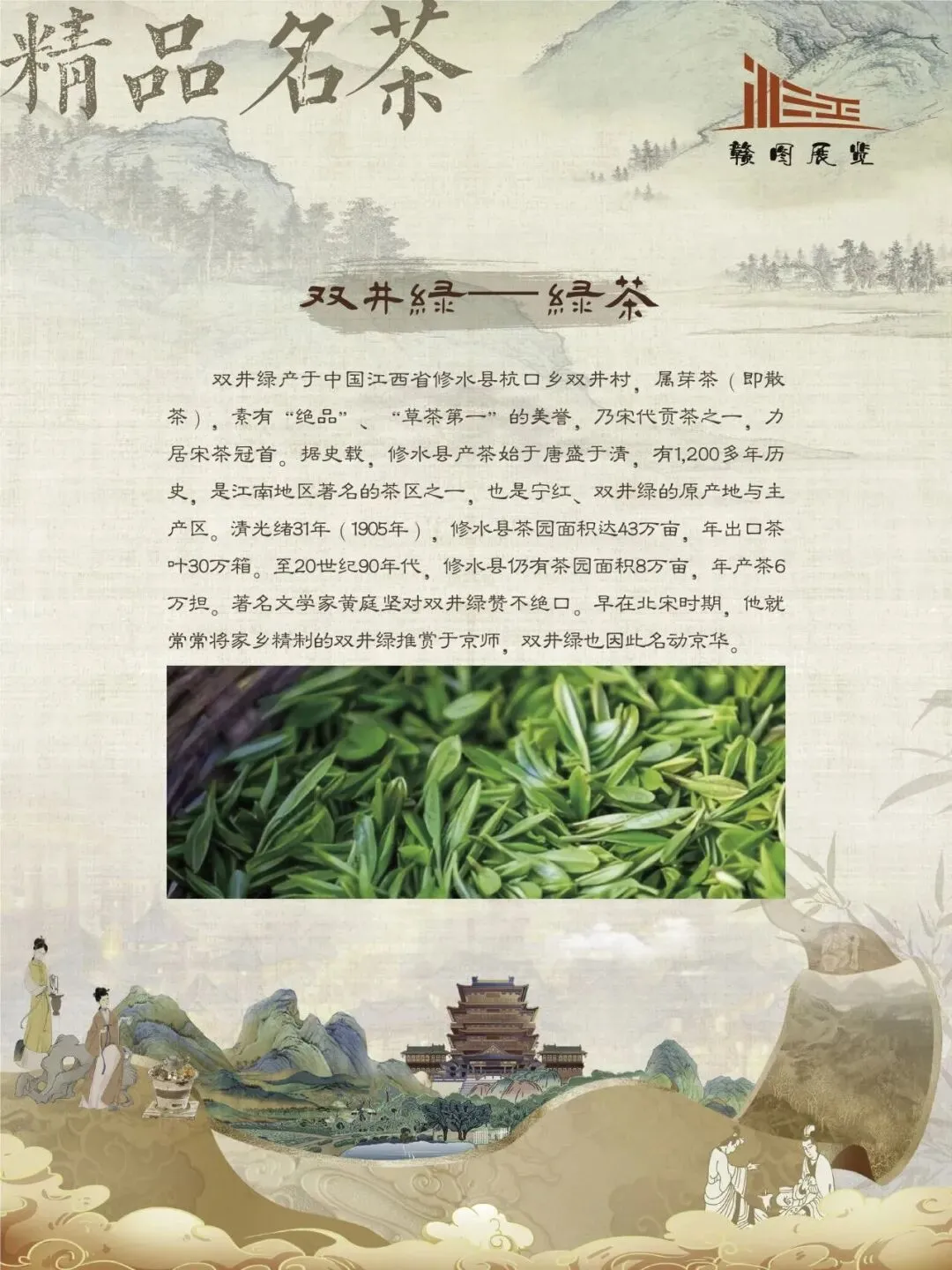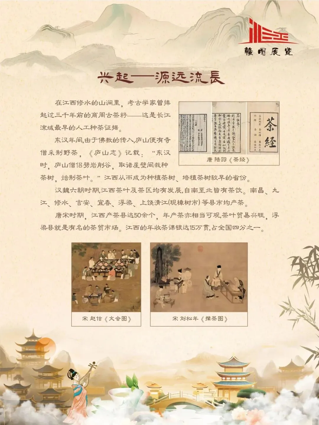 赣鄱大地,山水灵秀,云雾氤氲,自古便是茶香浸润的沃土。江西的茶叶文化,如一缕绵延千年的芬芳,深植于这片土地的脉络之中。从庐山之巅的茫茫云海,到婺源山间的碧绿茶园;从唐代舟头“商人重利轻别离,前月浮梁买茶去”的商贾盛景,到宋时禅林古刹中“茶禅一味”的哲思沉淀,江西的茶史既是自然的馈赠,亦是人文的瑰宝。 《茶香赣韵——江西茶文化展》邀您展开这幅茶香长卷,品味的不仅是茶的色香味韵,更是一方水土的灵性、一群匠人的坚守,以及一个民族对自然与生活的永恒礼赞。