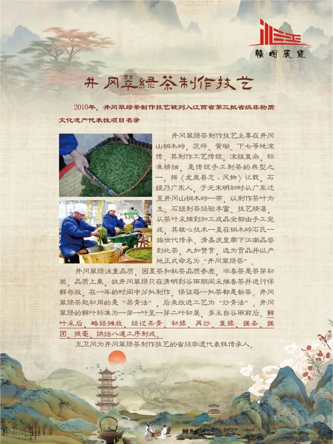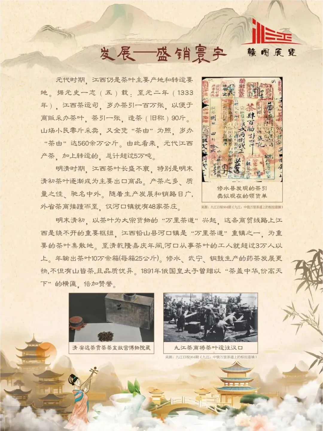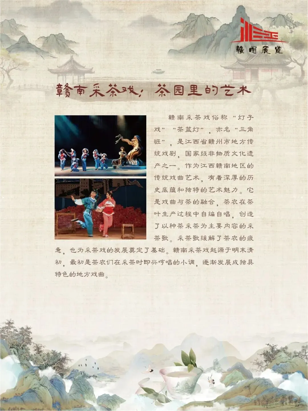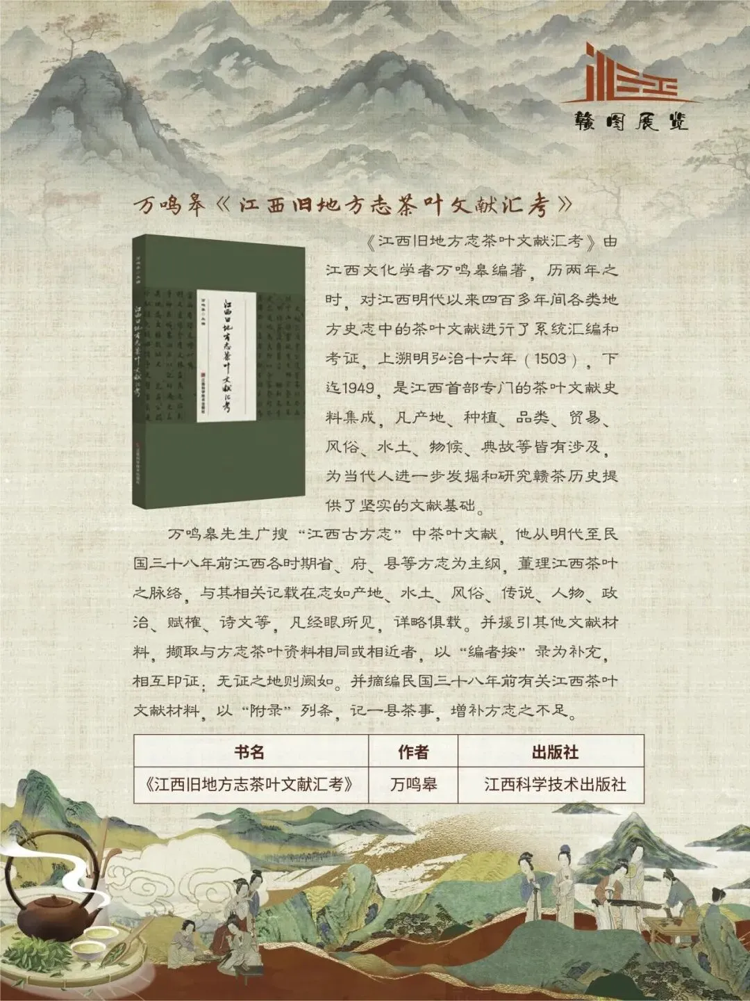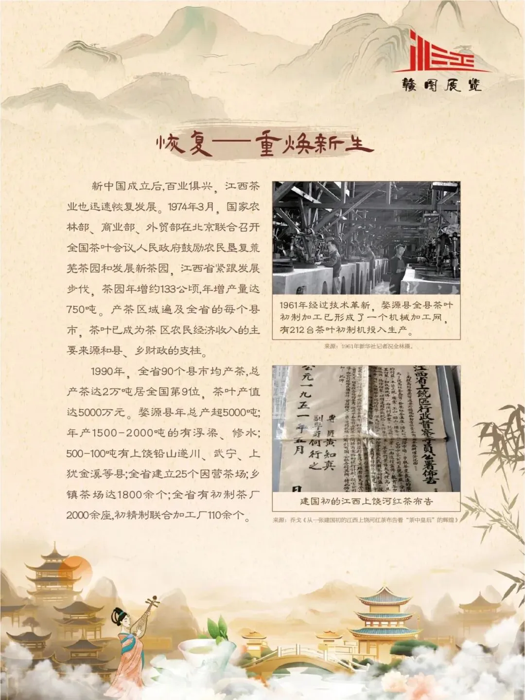 赣鄱大地,山水灵秀,云雾氤氲,自古便是茶香浸润的沃土。江西的茶叶文化,如一缕绵延千年的芬芳,深植于这片土地的脉络之中。从庐山之巅的茫茫云海,到婺源山间的碧绿茶园;从唐代舟头“商人重利轻别离,前月浮梁买茶去”的商贾盛景,到宋时禅林古刹中“茶禅一味”的哲思沉淀,江西的茶史既是自然的馈赠,亦是人文的瑰宝。 《茶香赣韵——江西茶文化展》邀您展开这幅茶香长卷,品味的不仅是茶的色香味韵,更是一方水土的灵性、一群匠人的坚守,以及一个民族对自然与生活的永恒礼赞。