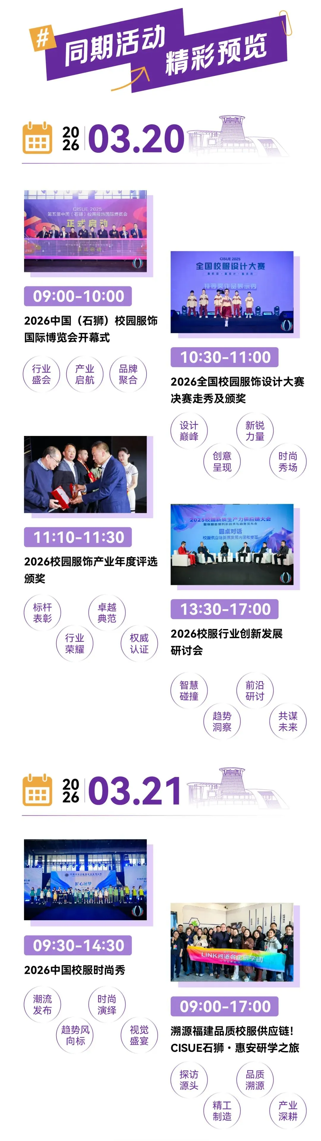 CISUE 2026中国(石狮)校园服饰国际博览会,将于2026年3月20日-22日在石狮服装城展览艺术中心盛大启幕。作为国内极具影响力的校园服饰专业展会,本届展会汇聚全产业链优质资源,聚焦校服创新设计、健康面料、智能科技与时尚文化,为教育部门、学校、经销商、品牌企业搭建高效对接、合作共赢的一站式商贸平台,同期重磅活动精彩纷呈,敬请期待!