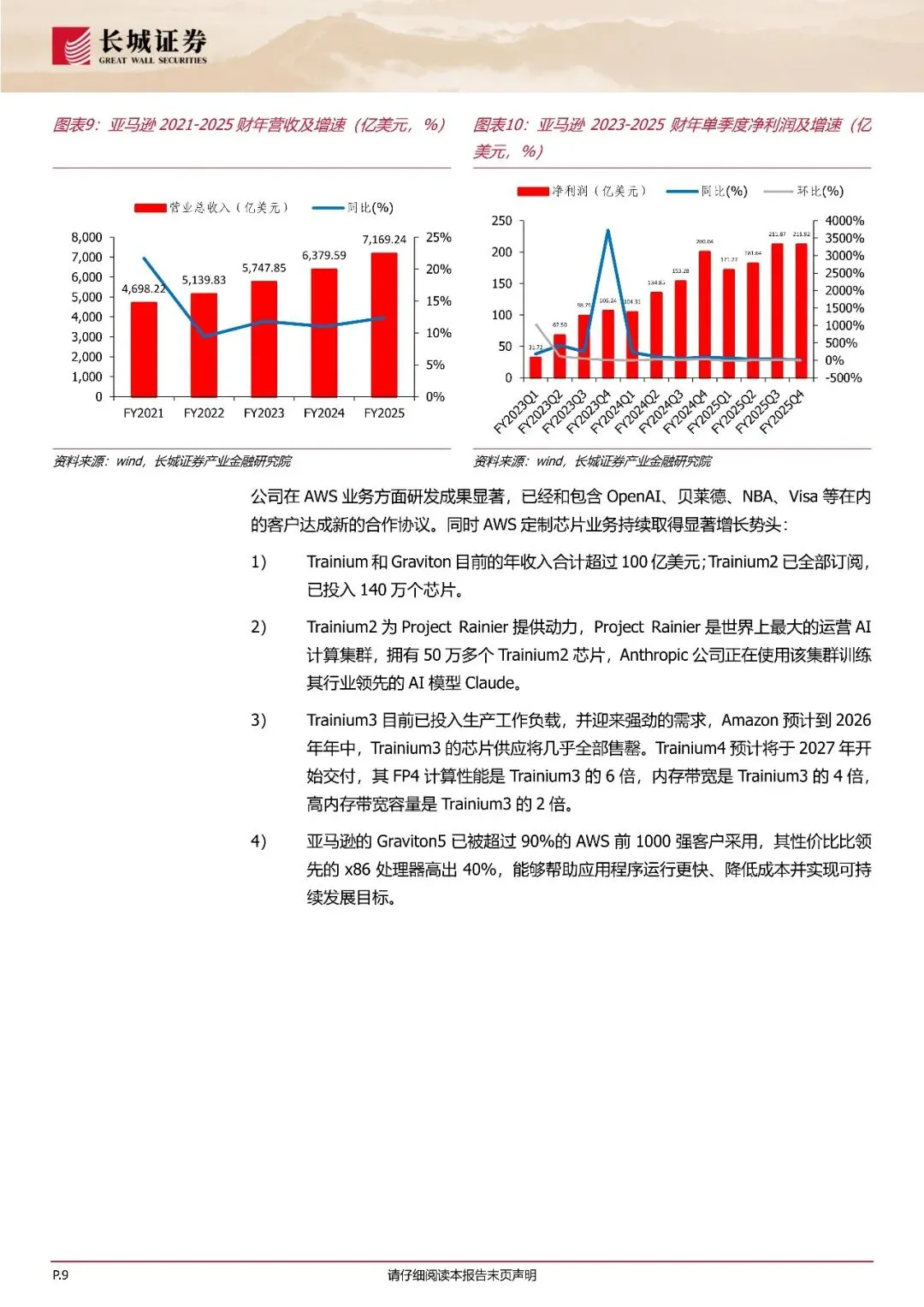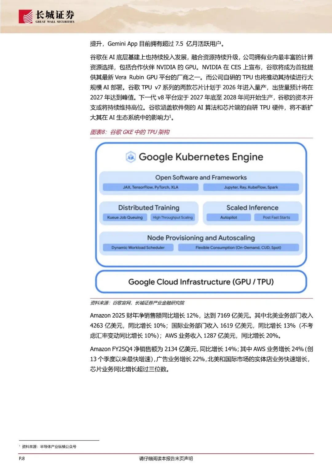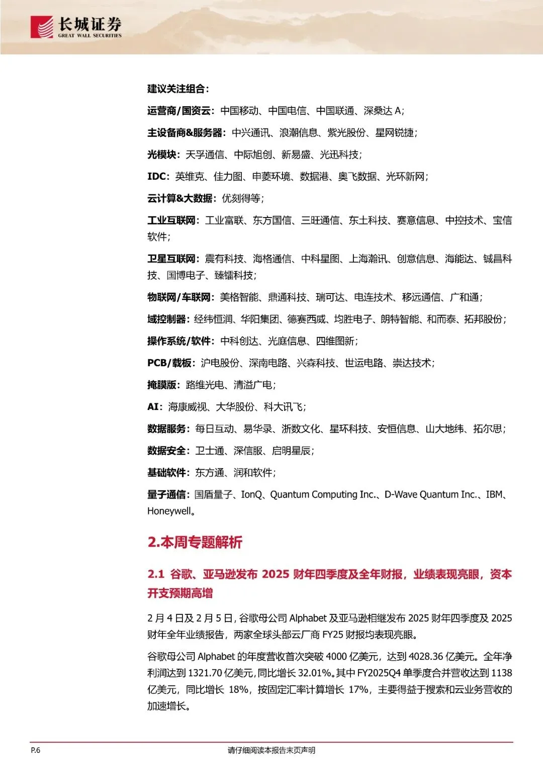 一、亚马逊谷歌业绩亮眼,资本开支力度持续加大。2月4日及2月5日,谷歌母公司Alphabet及亚马逊相继发布2025财年四季度及2025财年全年毕业绩报告。两家全球头部云厂商FY25财报均表现亮眼,谷歌Alphabet的年度营收首次突破4000亿美元。FY25Q4搜索业务继续加速增长,营收同比增长17%YouTube的年度营收(包括广告和订阅收入)超过600亿美元。同时,在12月发布Gemini3之后,用户参与度显著提升,Gemini App目前拥有超过7.5亿月活跃用户Amazon 2025财年净销售额同比增长12%,达到7169亿美元。FY25Q4净销售额额为2134亿美元,同比增长14%;其中AWS业务增长24%(创13个季度以来最快增速),广告业务增长22%,北美和国际市场的实体店业务快速增长,芯片业务同比增长超过三位数。更为突出的是,在谷歌和亚马逊发布2025财年业绩的同时时,宣布了2026财年资本开支投入预期将大幅提升。谷歌Alphabet宣布,2026财年预计资本开支将在1750-1850亿美元之间。Amazon预计其2026财年资本开始投入约2000亿美元。我们认为,全球人工智能领域的投入和基础设施建设持续加大,包含谷歌、马逊等在内的头部云厂商业绩表现持续亮眼,叠加资本开支力度不断提升,全球AI产业链景气度或将保持高涨。