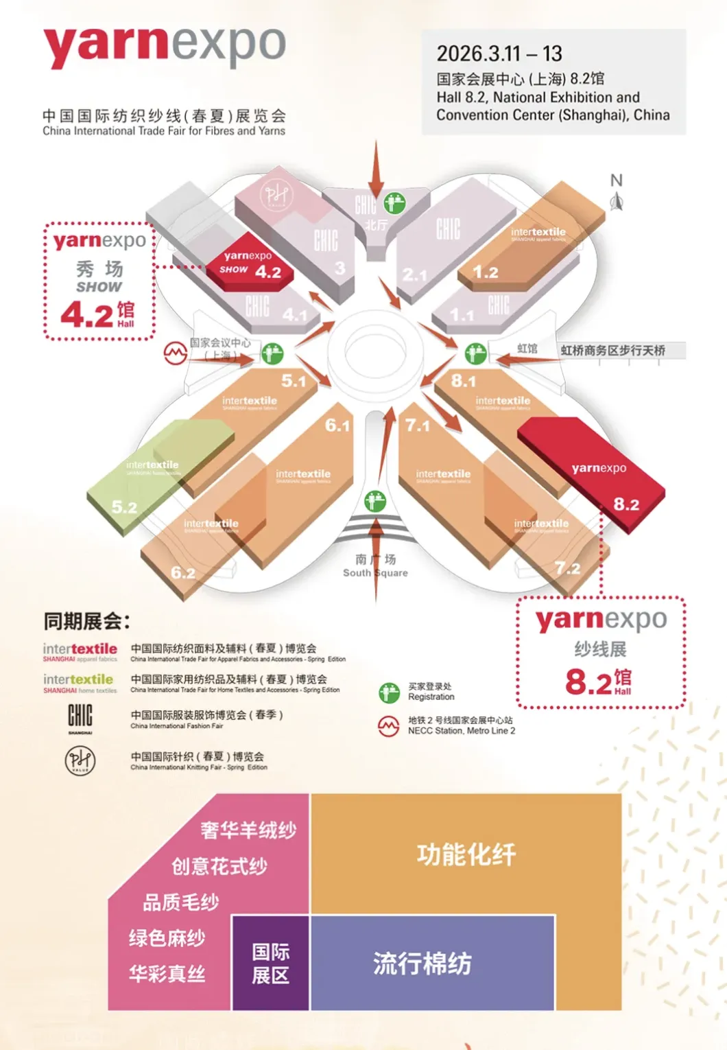 作为全球领先纤维纱线商贸平台,Yarn Expo春夏纱线展将于2026年3月11-13日在国家会展中心(上海)继续与Intertextile面料展、Intertextile家纺展、CHIC服装展、PH Value针织展五展联动,同期同馆举办。同期活动包括:中国纤维流行趋势发布、中国纱线流行趋势发布、企业新产品发布会、纺织材料创新论坛、直播逛展•高端访谈。