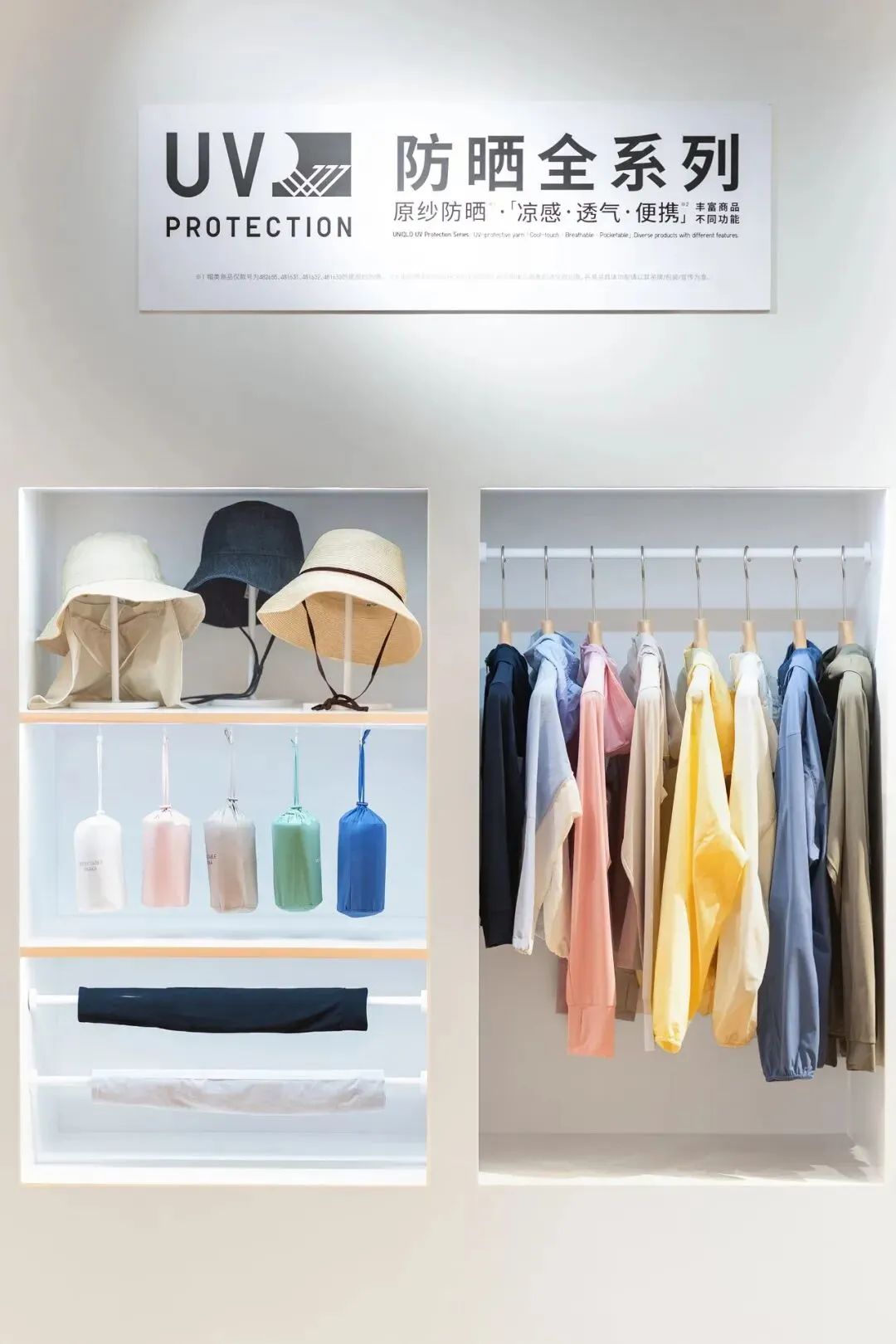 如果说颜色是“第一眼”,那这次最值得写的核心其实是功能性面料的存在感。展会里最明确的一条线就是「防晒全系列」,而且重点落在“原纱防晒”这件事上:不是后整理的概念,而是在原纱阶段就把防晒做进去。