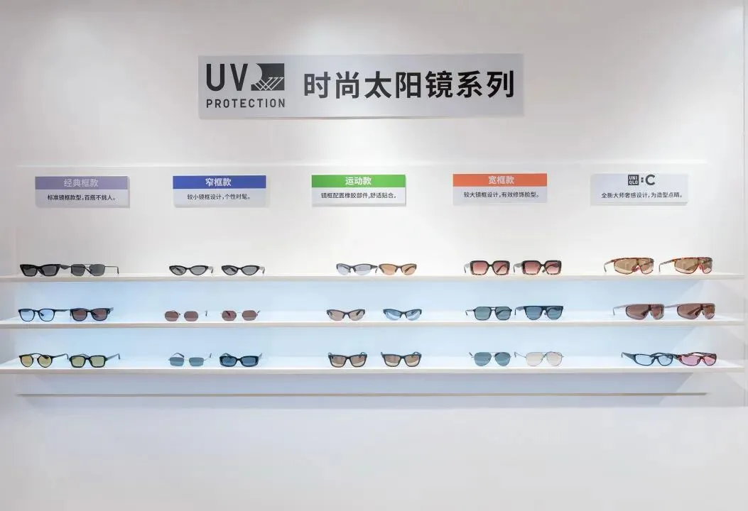 同样的“防护逻辑”并没有停在服装这里。展区里正面陈列的「奢感新款·太阳镜」存在感很强,关键字也讲得很明确:UV CUT 400 镜片、阻隔 99% 紫外线、降低约 25% 蓝光。