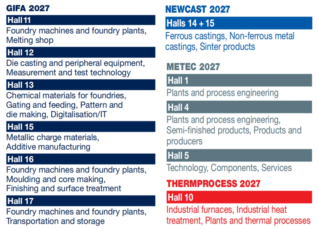 四年一届的德国国际铸造技术专业展会(GIFA)及国际精密铸件展会(NEWCAST)将于2027年6月21日(星期一)至25日(星期五)在德国杜塞尔多夫展览中心举办,同期还将举办国际冶金技术展会(METEC)和国际热处理展览会(THERMPROCESS),以及各类研讨会、专题论坛、技术交流会等系列活动,是一场不容错过的行业盛会。
