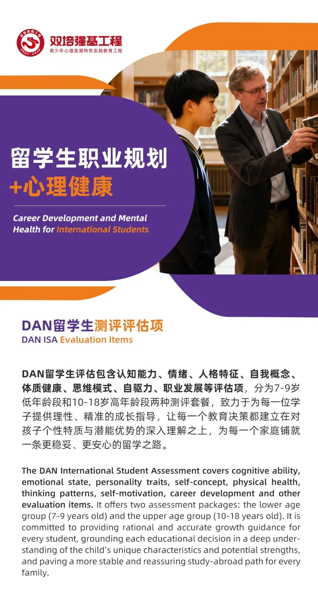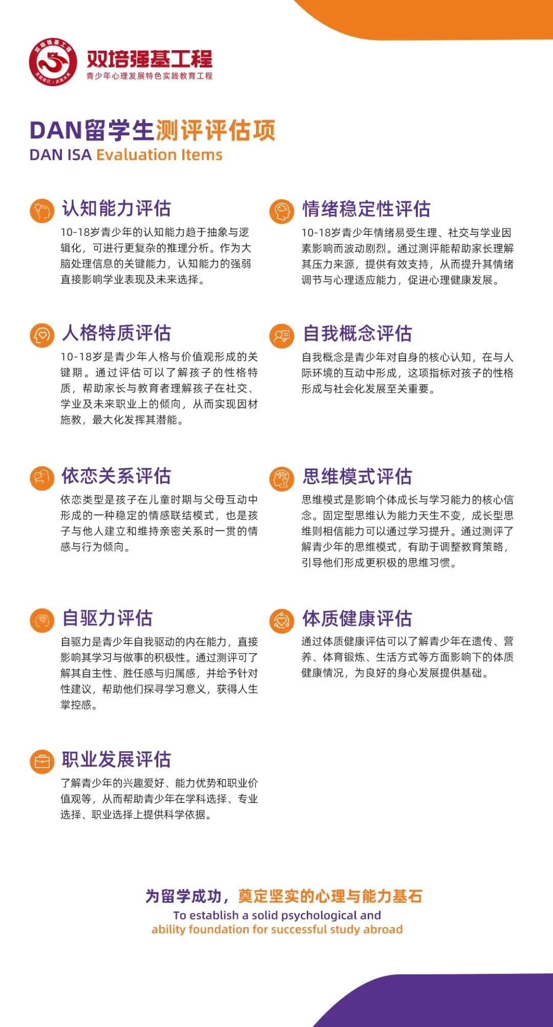 留学不仅是学业上的跨越,更是成长中的一场身心历练。DAN留学生评估包含认知能力、情绪、人格特征、自我概念、体质健康、思维模式、自驱力、职业发展等评估项,分为7-9岁低年龄段和10-18岁高年龄段两种测评套餐,致力于为每一位学子提供理性、精准的成长指导,让每一个教育决策都建立在对孩子个性特质与潜能优势的深入理解之上,为每一个家庭铺就一条更稳妥、更安心的留学之路。