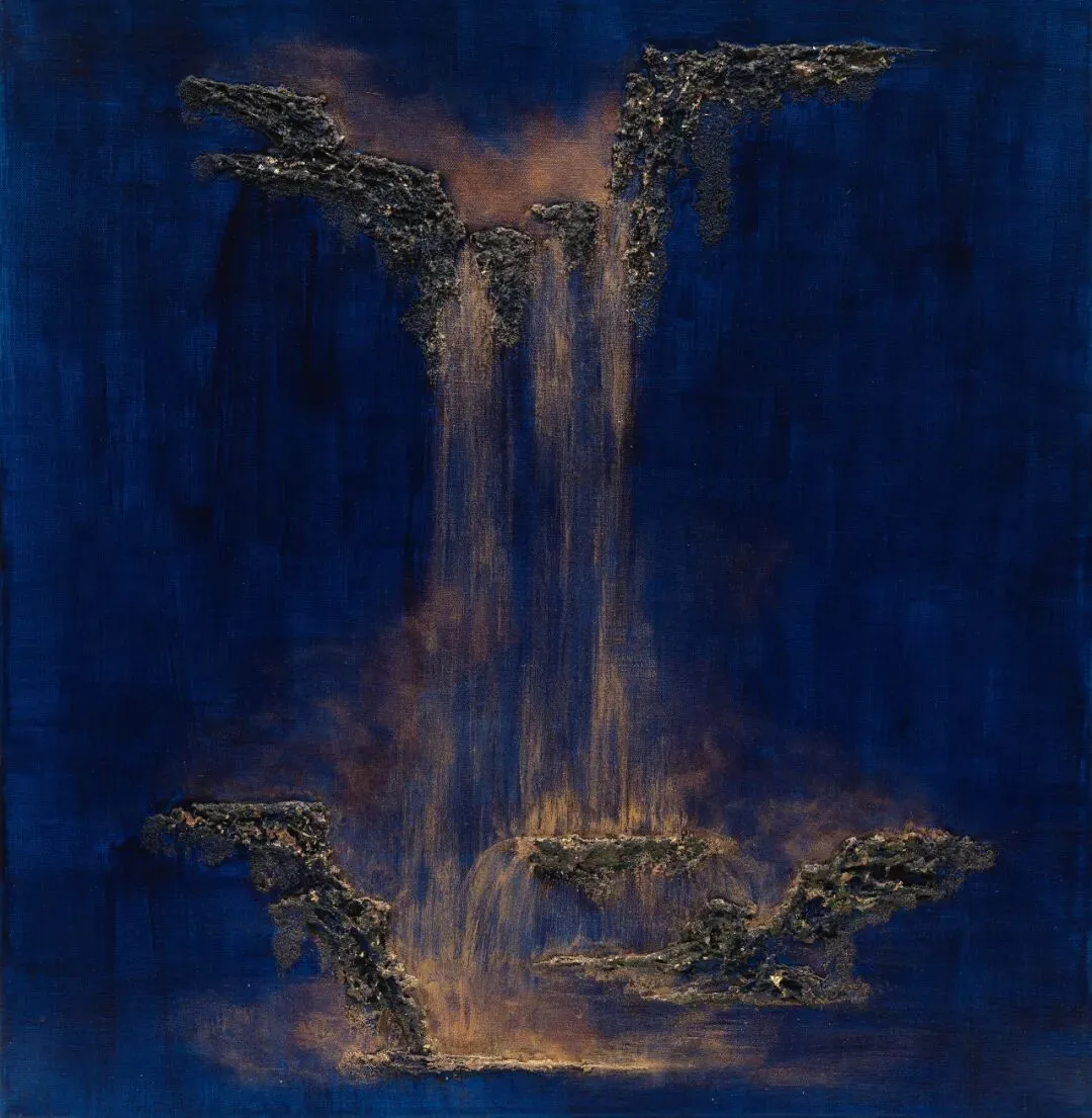 詹滢常作为当代中国艺术的代表性作者之一,拒绝选择直接把身体经验、家庭记忆或社会角色放到画面中央,用叙事对抗凝视。她矜持而坚毅地隐退到山水之后,让山、云、水发声。画面上没有直白的身体,没有图示化的时代标记,却充满对“伤痕”“结痂”“凝固瞬间”的敏感。瀑布像从撕裂处冲出的液体,金色山水里的闪光像被反复摩擦后的金属皮层,蓝色孤山在雾中孤立,像一块从大陆撕下的残片。这种不言自明的疼痛感,恰好是女性经验的一种隐忍倾吐:不控诉,把伤和韧性托付云水。