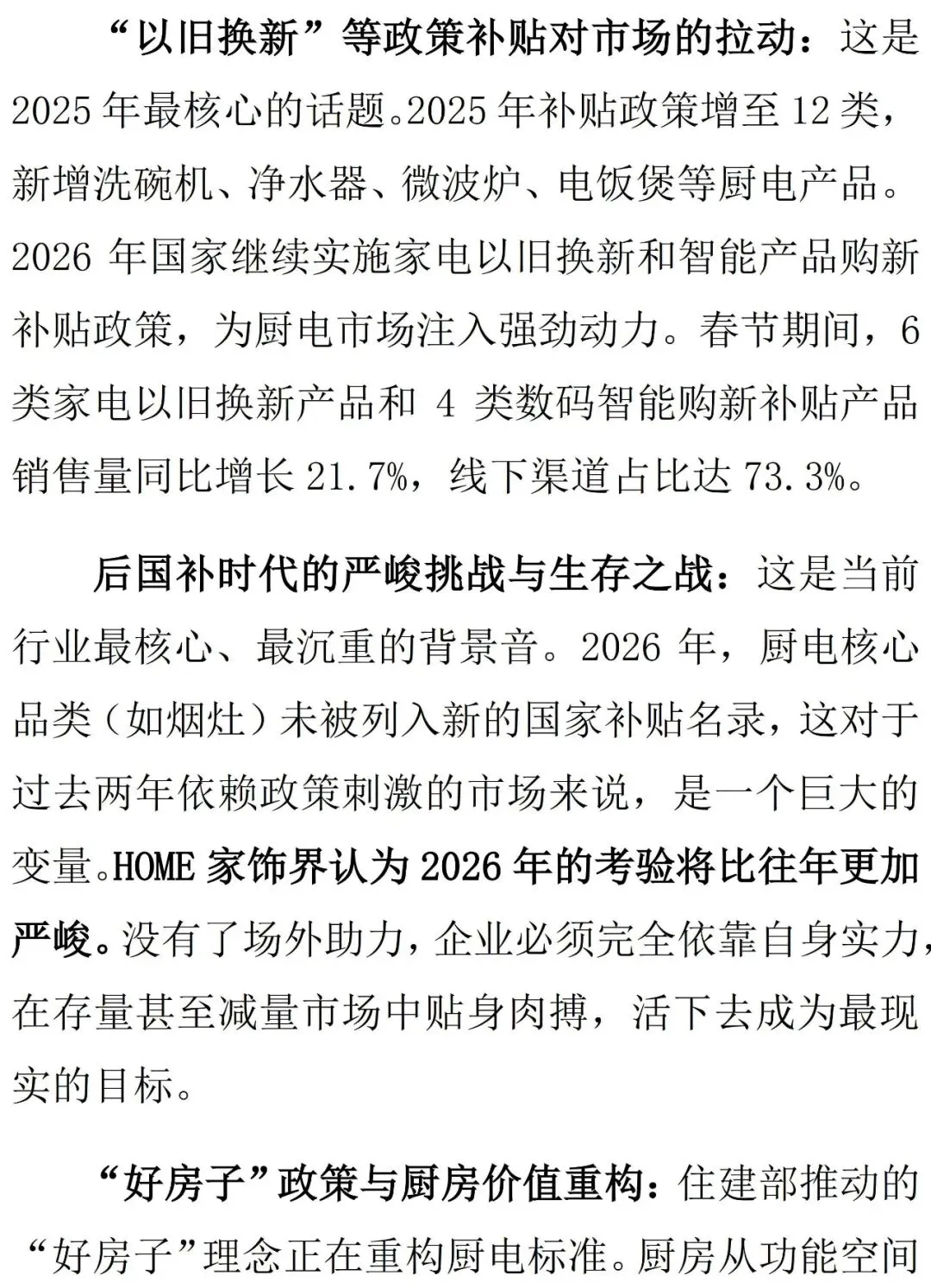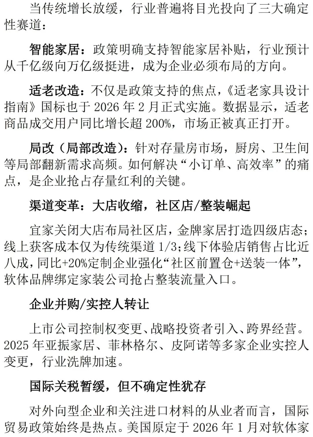 进入2026年,挑战并未消退,家居建材行业依旧呈现出其复杂性:全球经济复苏动力不够强劲、国内房地产市场仍在筑底、消费者信心还在修复中。但是2026年,对消费还是有诸多利好:国家将突出推动高质量发展、加快推动全面绿色转型、突出做强国内大循环作为“十五五”时期的主要目标和重大任务,这意味着国家促销费政策与资金将持续发力;在大众方面,2026年居民大额存单到期总额约50万亿至75万亿元,这些资金或将会有可观的一部分进入消费领域,提高生活品质的家居消费将是重点。HOME家饰界家居研究中心预测智能家居、健康家居、定制家居等细分行业将会成为2026年增长最多的领域。