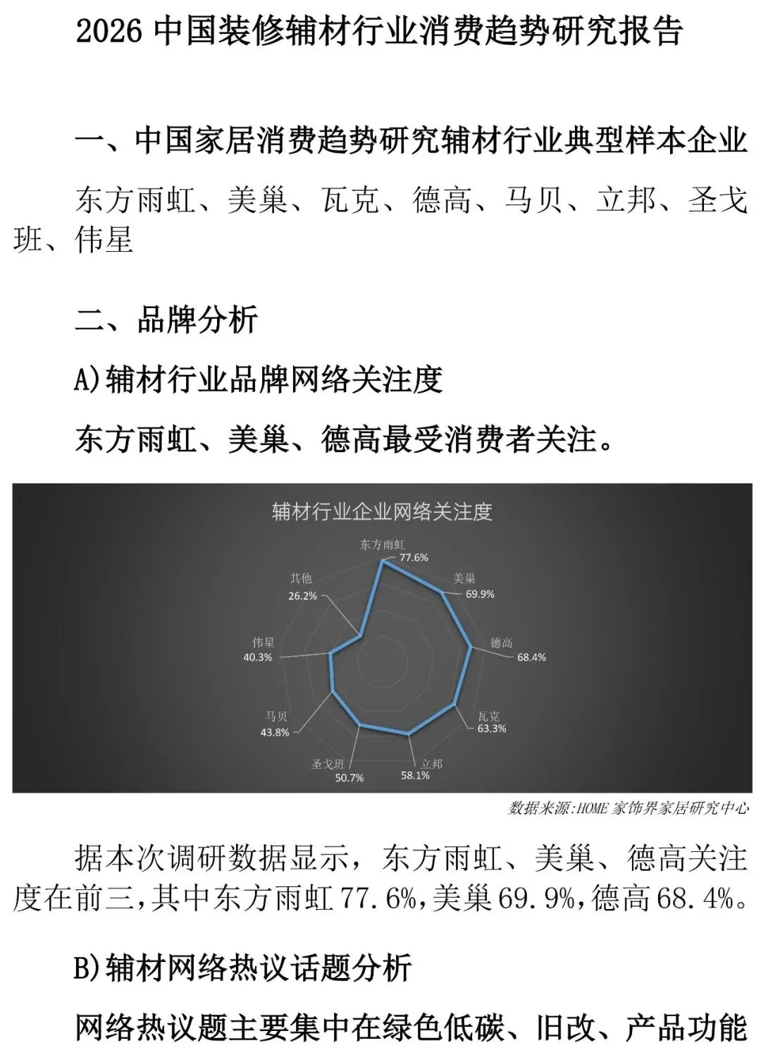 声明:本报告是基于消费者、业内人士、企业、行业协会、各受助单位或组织、各网站和媒体平台、企业经销商、家居卖场、设计师等公开披露的信息为核心依据的独立第三方研究,所载内容及观点客观公正。我们仅对我们采集的样本负责,但不保证网络公开数据的准确性及完整性。