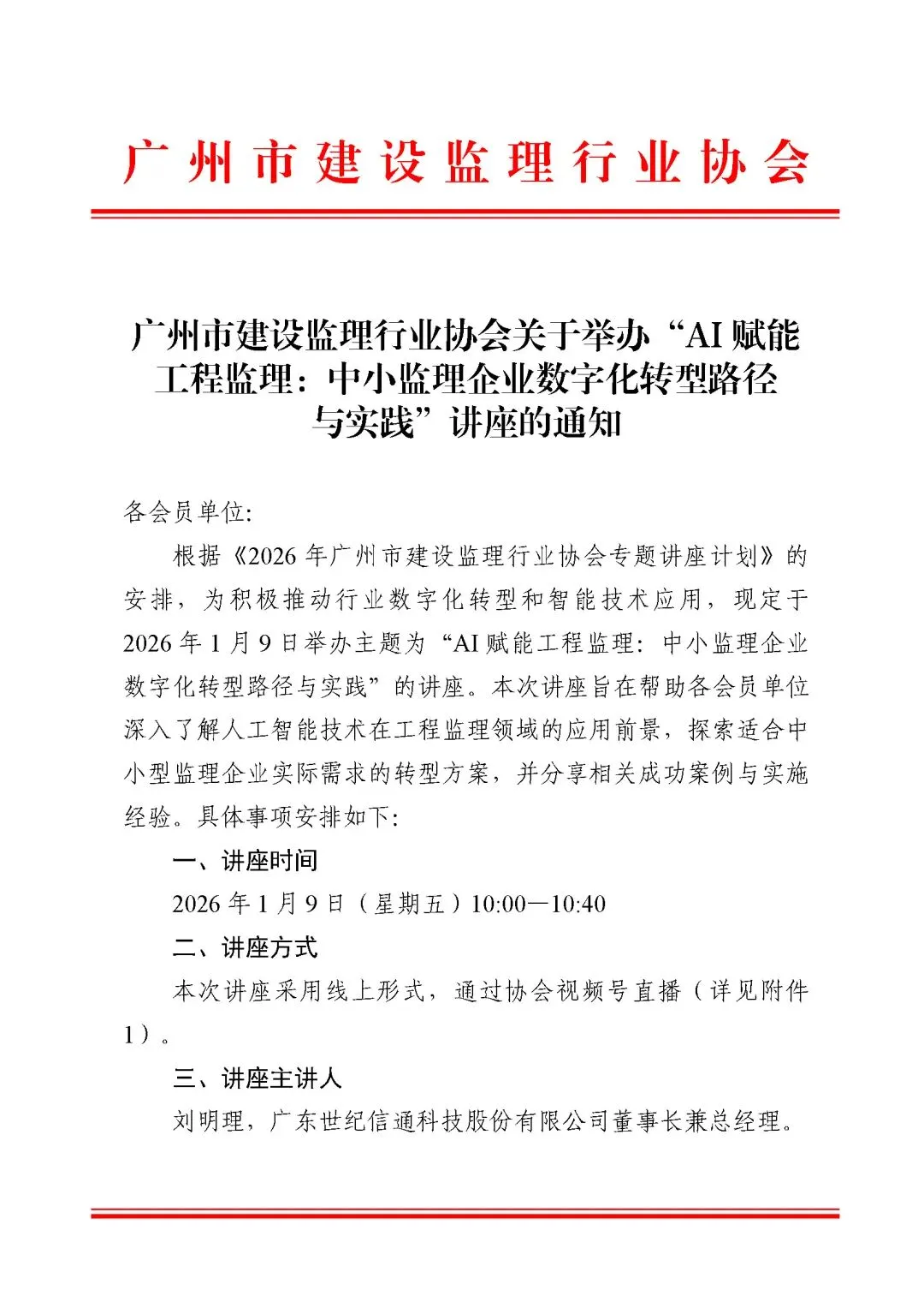 广州市建设监理行业协会关于举办“AI赋能工程监理—— 中小监理企业数字化转型路径与实践”讲座的通知