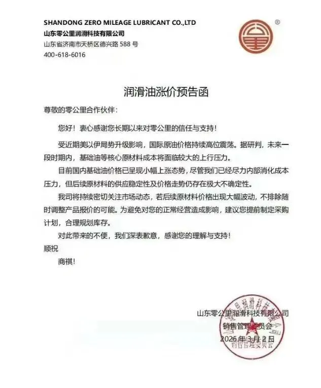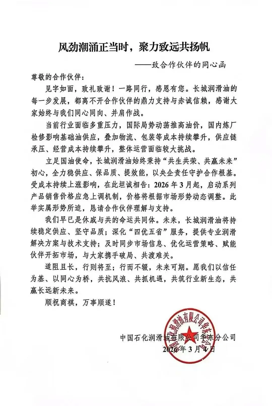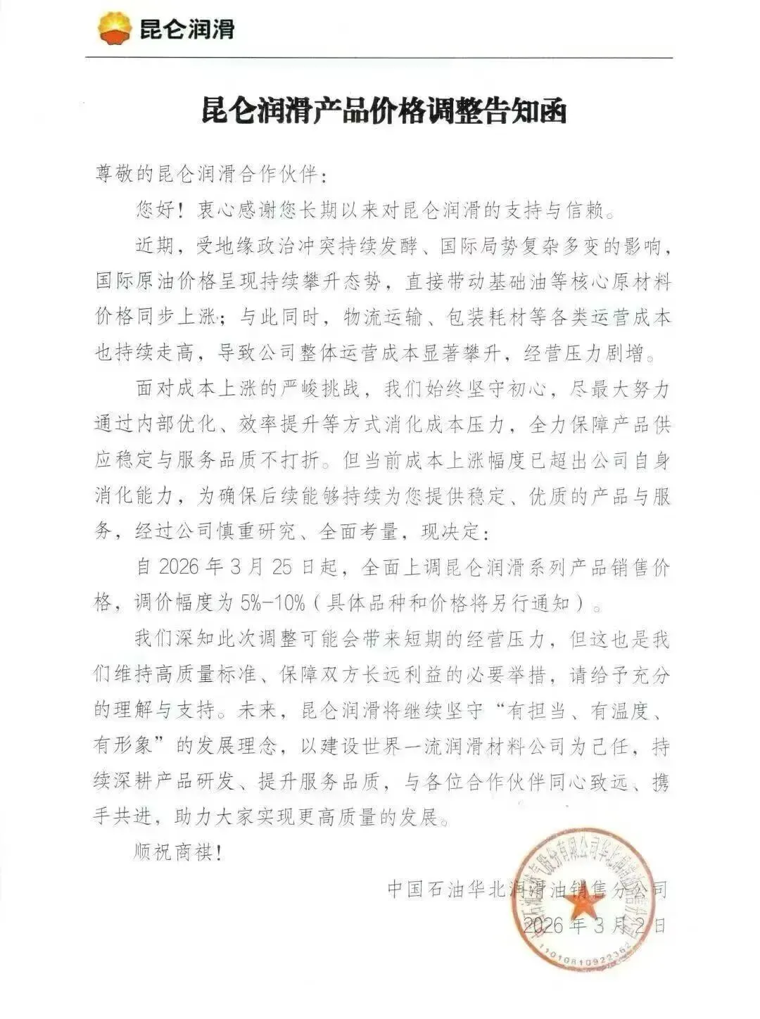 昆仑润滑自2026年3月25日起,全面上调昆仑润滑系列产品销售价格,调价幅度为5%-10%(具体品种和价格将另行通知)。