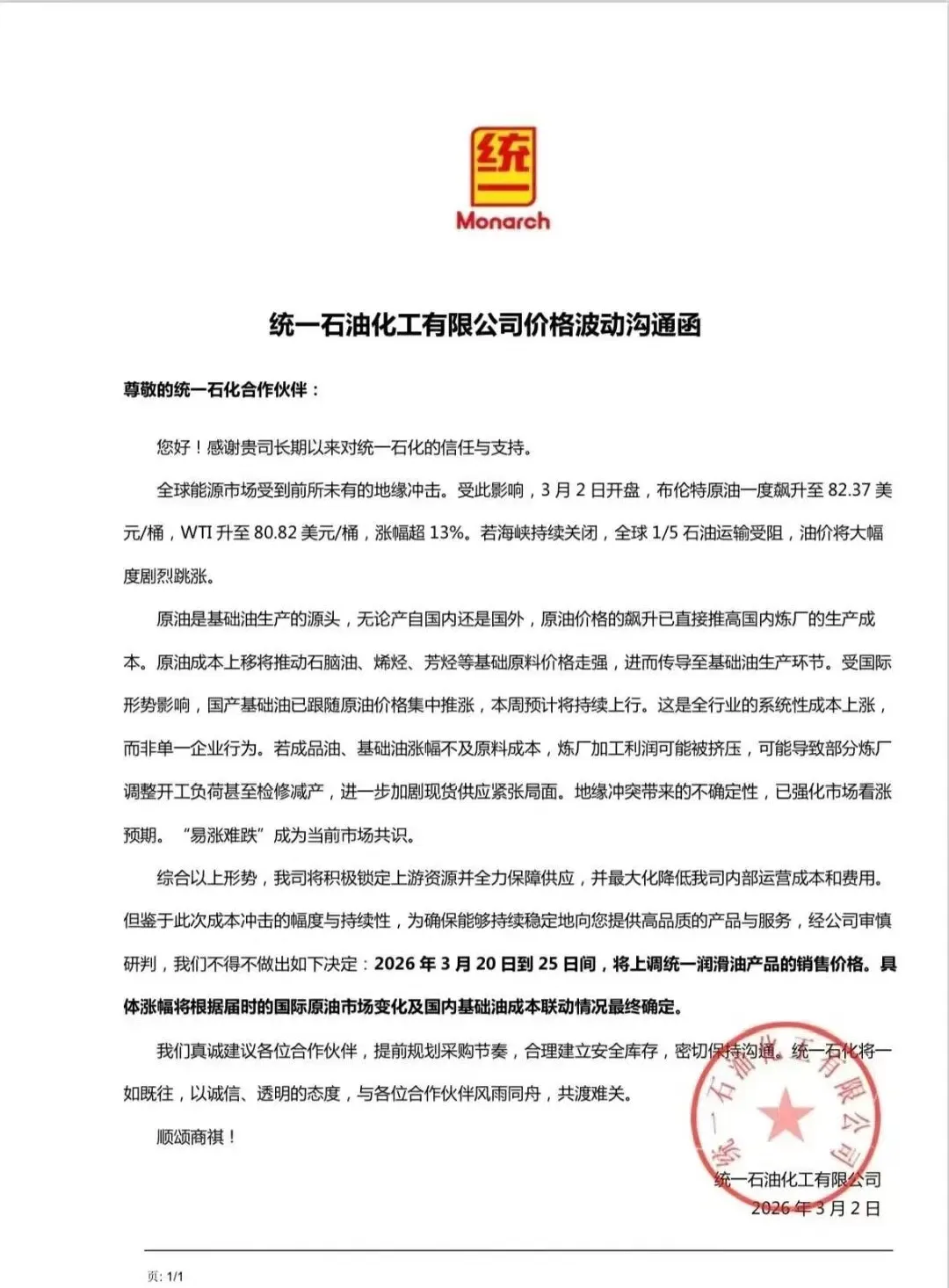 近期受国际原油价格剧烈波动影响,截至3月5日收盘,WTI原油价格已较2月27日,五个交易日上涨17.24%;布伦特原油则上涨15.20%。上游炼厂市场交易以当日有效报价为准,口头协议作废;下游润滑油企业开始发布涨价,以下为近几天各厂商发布的涨价动作。