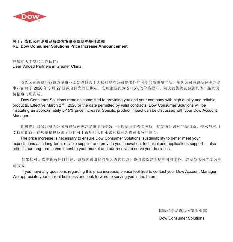 陶氏公司消费品解决方案事业部将于2026年3月27日或合同允许日期起,实施涨幅约为5-15%的价格提升。