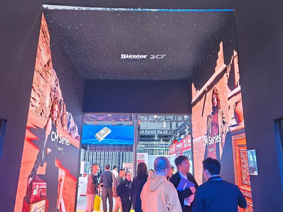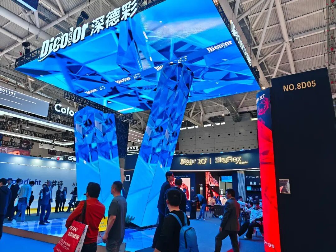 展位核心区域打造“天幕 + 立柱 + 地面”一体化沉浸式视觉空间,全面呈现深德彩在高端舞台显示产品领域的综合实力。