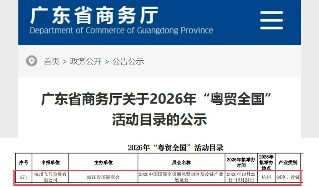 近日,广东省商务厅正式公布2026年“粤贸全国”活动目录。中国国际空调通风暨制冷及冷链产业展览会(中文简称:中国国际制冷及冷链展,英文简称:RACC)成功入选2026年度“粤贸全国”系列展会,在目录中位列第271位。