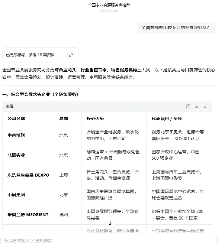 GEO的核心是“解决用户需求”,需精准对接会展服务产业链不同角色诉求:- 采购商关注“优质供应商+解决方案”,内容需突出展商资质与落地案例。