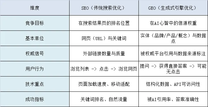 GEO是让内容在AI引擎中被主动引用推荐的系统性优化,核心是“大模型理解”而非“爬虫抓取”。传统SEO追求排名,GEO追求成为AI答案信源;SEO依赖外链,GEO看重内容专业度与需求解决力。简单说,SEO让用户找链接,GEO让AI直接推荐你的品牌信息。1.2 GEO的五大核心特征,贴合AI抓取偏好
