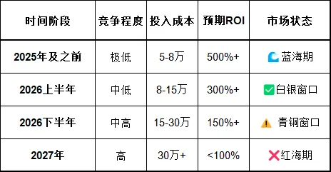 2026上半年为白银窗口,投入8-15万,ROI可达300%+;下半年竞争加剧,投入升至15-30万,ROI降至150%+;2027年进入红海,投入超30万,ROI可能低于100%。10.2早布局的三大优势