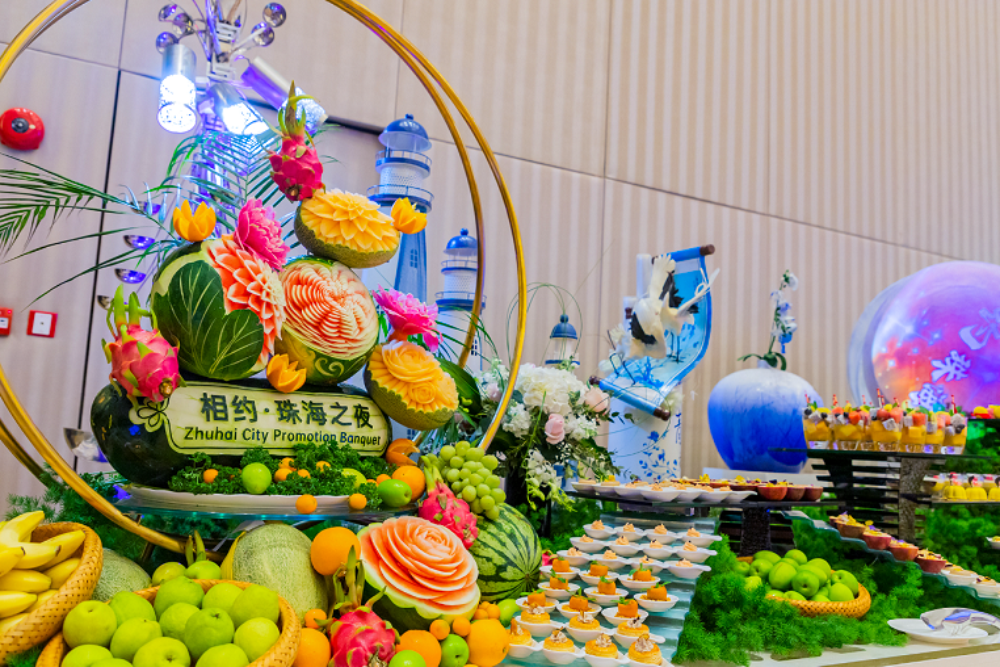 企业星级餐饮团队精心设计,为各国来宾献上了一场精彩的晚宴。场馆两侧分设中式点心区和西式甜品区,来宾在品尝甜点时可感受到中西美食的不同魅力。在甜品区的起点,美术厨房出品的果蔬雕完美呈现了国花牡丹的端庄秀雅之姿,吸引了众多来宾的眼光。菜品方面,餐饮团队充分考虑来宾的餐饮习惯,烹饪各类牛肉、羊肉菜品时严格遵循清真规范,并在台卡制作上下功夫,专门添加了色彩标识,让来宾可轻松辨别菜品是否含有牛肉、羊肉、海鲜等成分。