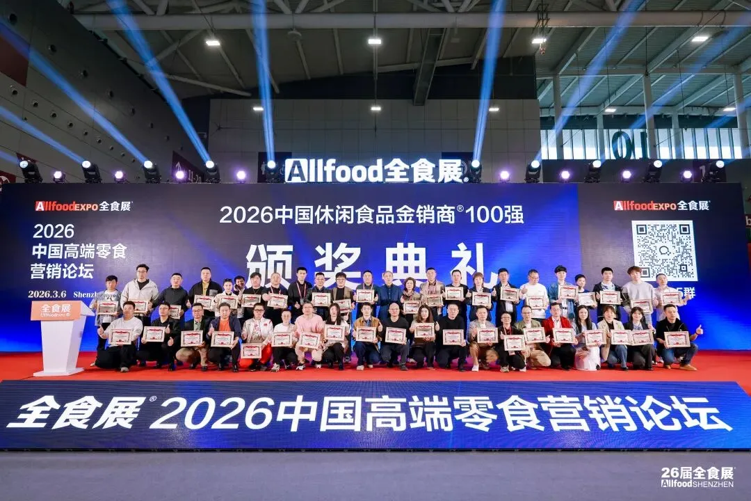 作为全食展传统亮点与行业年度盛事,备受瞩目的“金销商”大奖(春季) 颁奖典礼于首日下午隆重举行。现场依次发布“2026中国休闲食品金销商100强”“2026中国卡通玩具食品金销商25强”“2026中国乳品饮料金销商25强”“2026中国零食连锁店25强”等几大大榜单,“2026中国冰淇淋冷食连锁家批店25强”“2026中国冰淇淋金销商50强”将于3月7日上午颁发,共计375位来自全国各地的优秀经销商代表荣登榜单,接受行业致敬与赞誉。同时公布“2026中国糖果巧克力金销商50强”“2026中国速冻食品金销商50强”“2026中国休闲食品水果礼盒渠道金销商25强” 三大入围榜单(正式榜单将在2026杭州第27届全食展公布),全面覆盖食品饮料主流赛道。