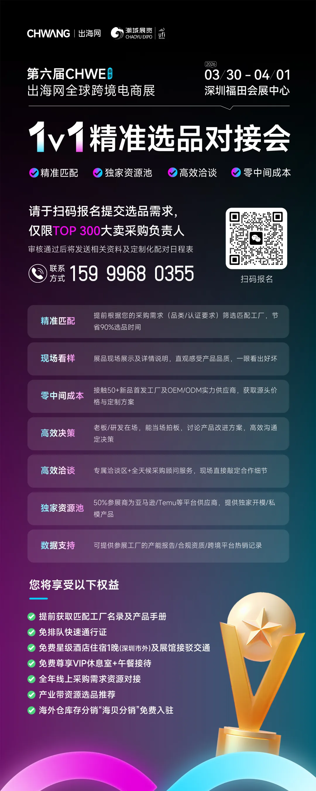 2026第六届CHWE出海网全球跨境电商展(深圳) 将于3月30日至4月1日在深圳福田会展中心隆重举行。其核心活动——“大卖专属1V1精准选品配对会”,正是为您量身打造的年度开品盛宴!