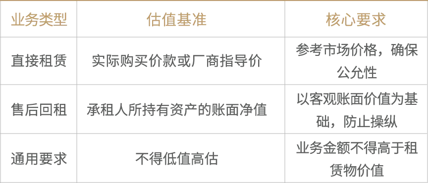 差异化安排的理由在于:直接租赁中租赁物为新购资产,实际购买价款具有较高可信度;售后回租中租赁物为存量资产,账面净值虽可能偏离市场价值,但相较于随意评估更具可验证性与抗操纵性。